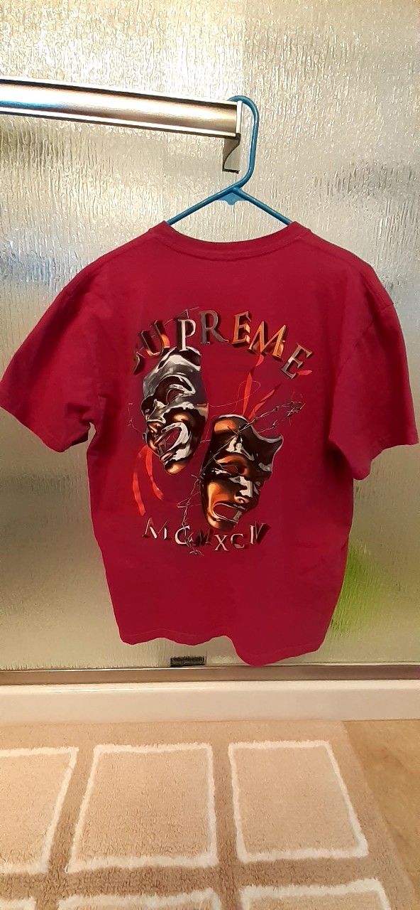 Magenta cotton T shirt with screened comedy and tragedy masks ringed with barbed wire. Smaller screening on front left, large screening across the back of the shirt. I also have 1990 MC Escher all over print T-Shirt Incredible all over print MC Escher tee from 1990. Iconic design featuring some of the artists most famous works, notably ripped by Supreme but this is an original. Authroised by the Escher Estate. A classic piece. 100% Cotton made in USA on an Andazia tee - perfectly worn in and faded with a slight aged hue that really sings Single stitch shirt, I also have Original 1987 Megadeth Peace Kills Tour Shirt. This is a true vintage shirt, not a modern reproduction. Sizes vary is mabe fit if you are medium or large size I already have offert in it so be reasonable offert I let you know in a couple days.i also have a Rolling Stones A Bigger Bang Concert Tour Shirt Adult Size XL Black 2005 Authentic vintage the Rolling stones tshirt 1981 best offers take it.I have a bunch of vintage, rear, newer brand clothes, shoes, and accessories. I have vintage sports jackets, vintage college sweaters, Vintage concert T-shirts. Vintage Jerseys, and more vintage wear. I also have newer clothes for mens and womens. I have north face and , Patagonia and Colombia jackets and more, I have work jackets for men like carhartt jackets and dickies. I have the north face, Patagonia, and Colombia jackets for mens too. i also have work boots like red wings thorogood and more, I also have Donner boots and collection toys and cards and coins and legos and other stuff like vintage clothing tshirt and sweater shirts and sweaters, pokemond card Harley Davidson jacket and shirts an Couch purses, pink clothing and more I have pokemon and sport cards also lululemon clothing and true religion and rock revival pants