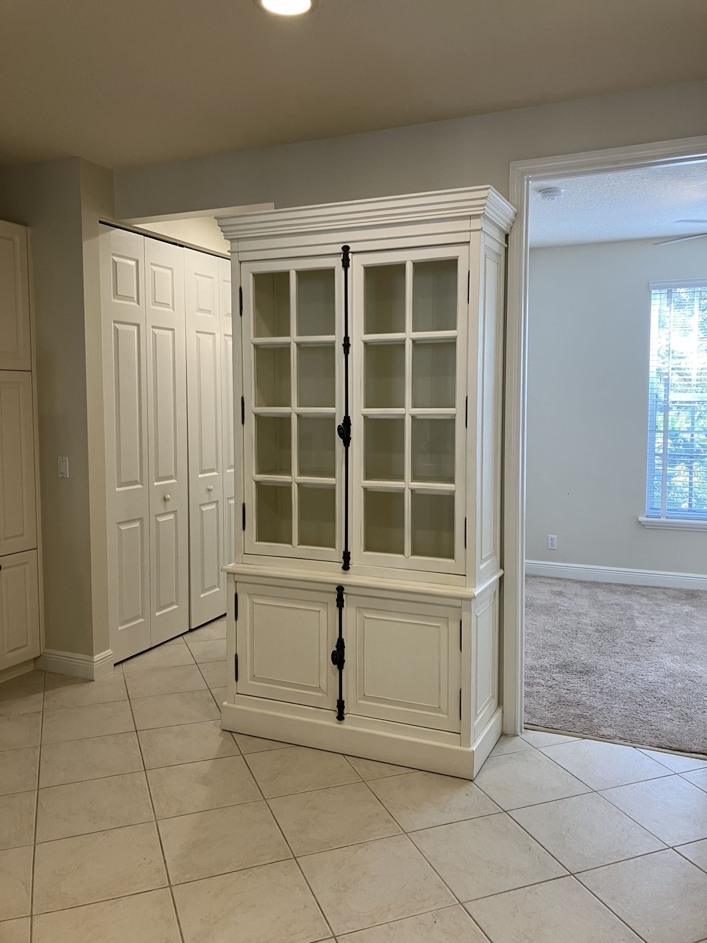 Very nice white wood cabinet, a blend of classy elegance and functionality. Crafted from wood and wood veneer. This piece features faux wood carved features and crown molding trim. The classic carved detail, glass display, and inner storage, provide charm and character, alongside ample storage. Easily costs over $500 or more when new. Local pickup in Jupiter. Act fast.