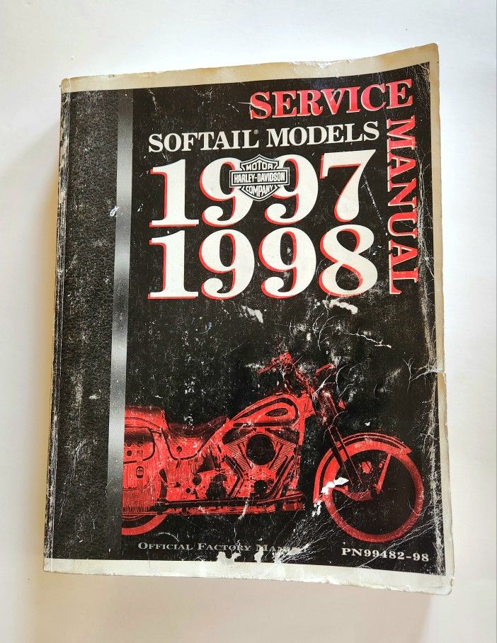 (Used) Vintage 1997 through 1998 Harley Davidson Softail Service Manual // single owner // paper back cover // cover has some wear // some pages open up with diagrams //No ripped pages // Pick up only, No delivery or shipping // asking $40.00.