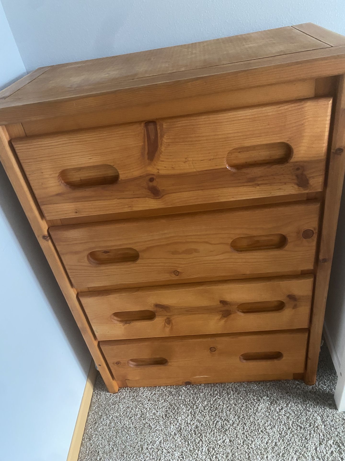 Solid wood dresser I sanded the top in hopes to stain/ refinish , got pregnant and unable to finish Easy to cover top until refinished Drawers all clean and functional Measurements 32 wide 17 1/2 deep 42 tall Make an offer