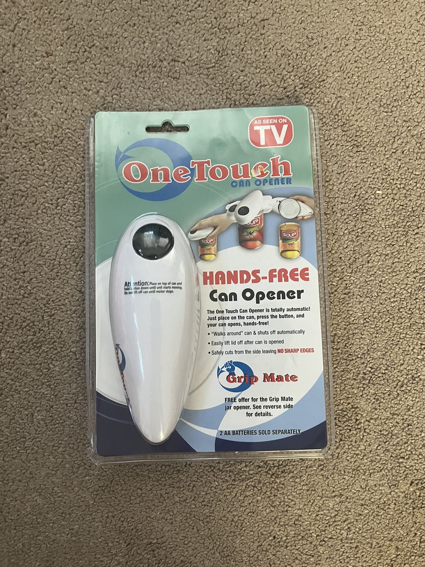 This Hand Free Can Opener by One Touch is fully automatic. With the press of a button it will open your can for you. Just simply place it on the can, press the button, and your can is opened. It cuts around the she’s on the top of the can, open ring the can leaving no sharp edges. The Can Opener used 2 AA batteries batteries which are not included.