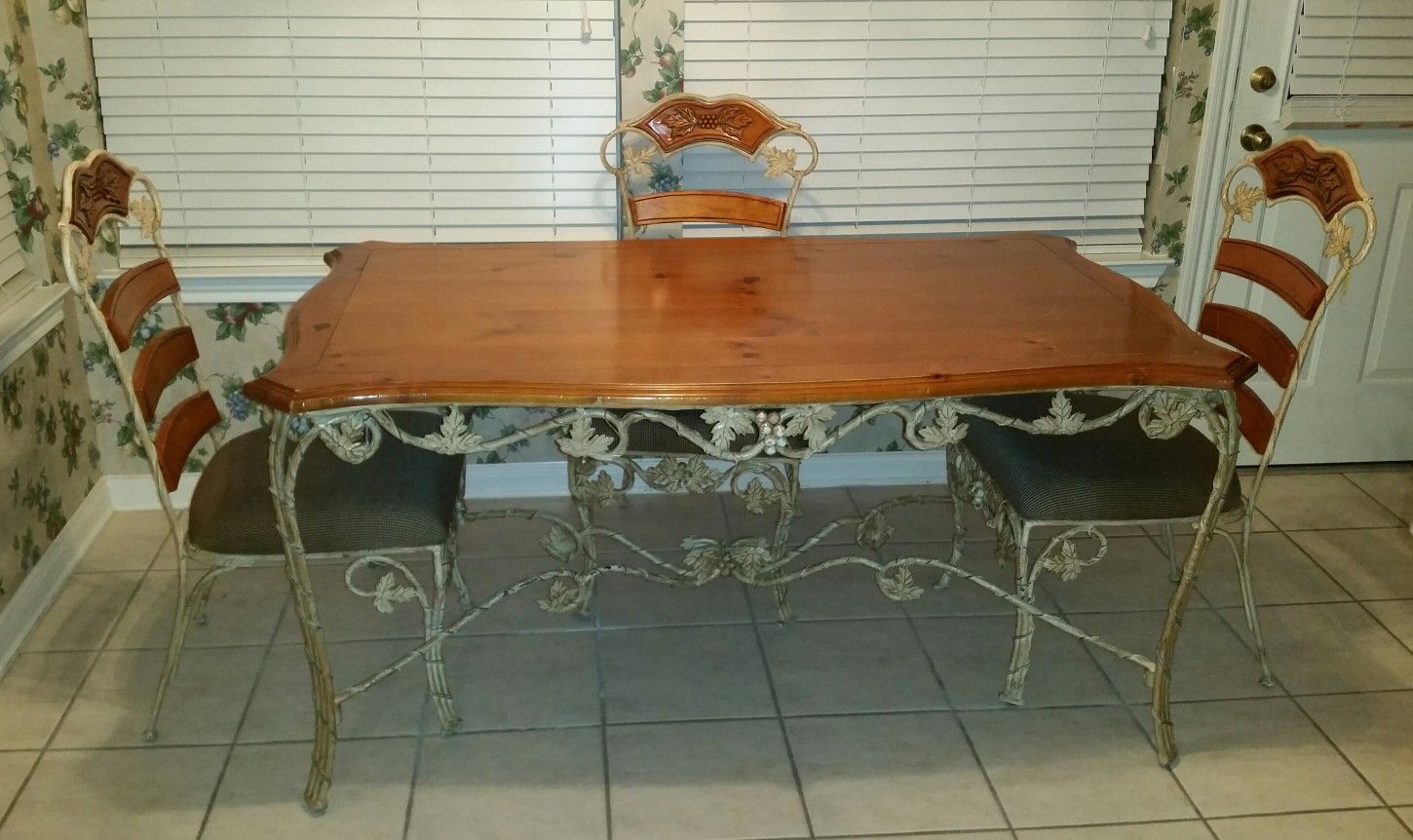 All wood and iron dinner table with 4 matching chairs in very good condition Perfect for breakfast area .