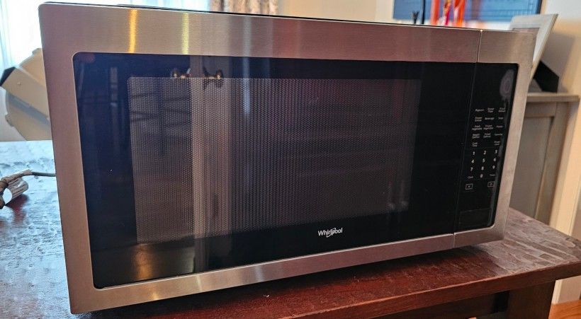 Whirlpool 1200W microwave, 24" W x 18-1/4" D x 13-1/2 H, like new, can be used as countertop or installed in cabinet with trim kit (not included). https://www.whirlpool.com/kitchen/cooking/microwaves/countertop/p.2.2-cu.-ft.-countertop-microwave-with-1,200-watt-cooking-power.wmc50522hs.html