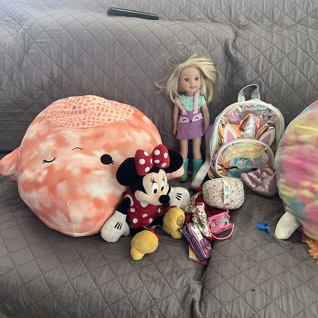 Numerous gently used (if used at all) stuffed animals plus one American Doll