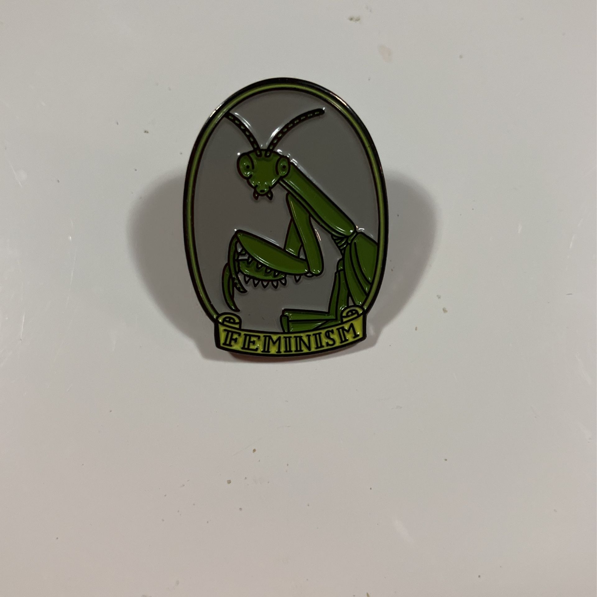 “Feminism” banner in front of a praying mantis design. Comes with backing, don’t recall original artist unfortunately.