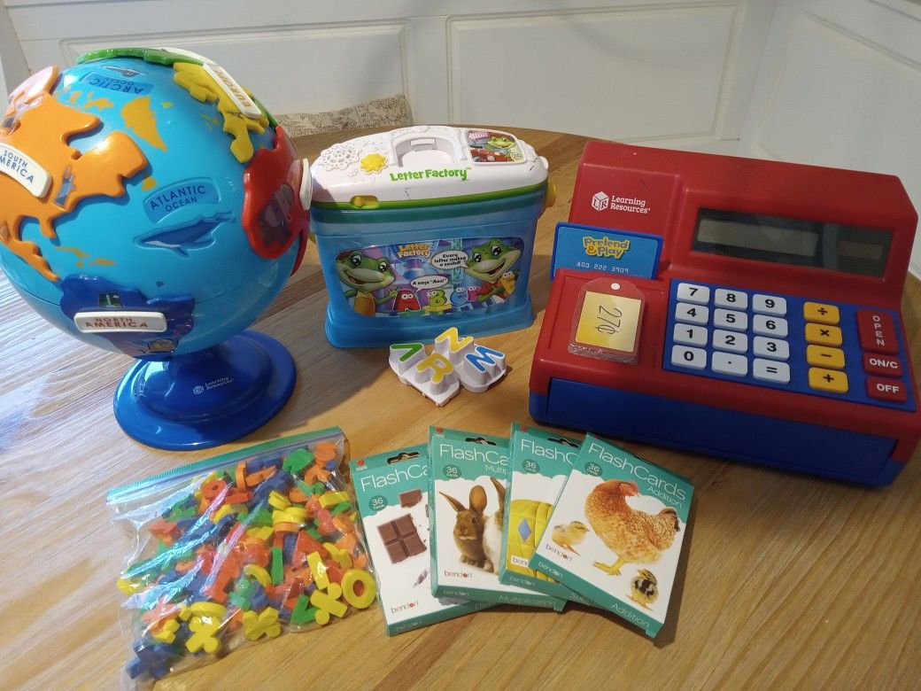 Lot of educational toys. Includes Learning Resources puzzle globe, Learning Resources cash register with play money, "credit card" and price tags, Leap Frog Letter Factory with all of the alphabet, math flashcards (addition, subtraction, multiplication and division) and number erasers for math problems. Non smoking home.