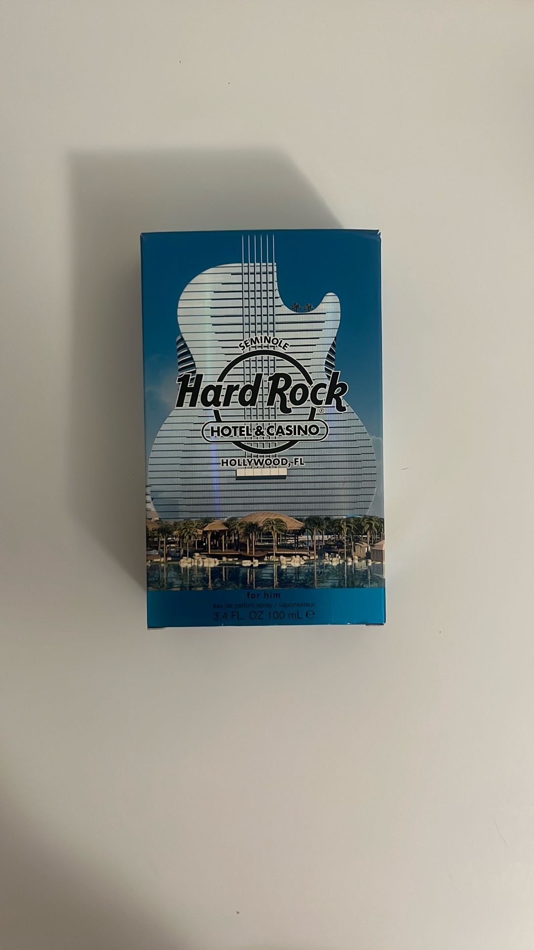 Man’s French Perfume Eau de parfum Man's "eua de parfum" perfume. This perfume is made in France and is distributed by Guitar Fragrance Co. Hollywood, Florida. The spray bottle is in form of a guitar with ice blue stripes and the neck is in a silver color. The Hard Rock Hotel & Casino logo to the bottom right of the bottle with "Seminole" above it. The bottle holds 3.4 oz. of perfume. The box has the famous gray Hard Rock Hollywood Hotel & Casino big guitar in front with the Hard Rock Hotel & Casino logo and under it "Hollywood, Fl. " Under the big gray guitar it has a pool scene, 3.4 oz., 100ml, "for her" eau de perfum spray and vaporisateur. The perfume is sold at the Seminole Hard Rock Hotel & Casino and retails for $90.00.