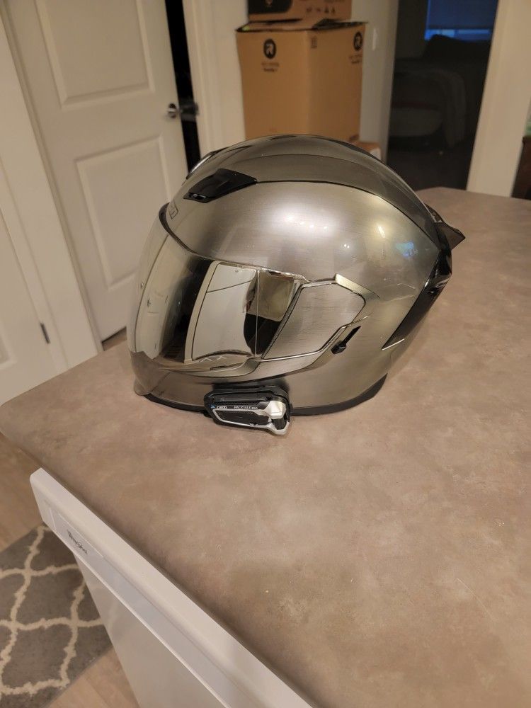 This is an XL Icon Airflite Quicksilver. Gently used, about 500 miles under it. Cardo Packtalk bold with JBL speakers. Condition is like new. Never dropped, no scratches. Comes with an upgraded Silver RST faceshield. This thing is definitely a head turner. Awesome for connecting to cell phone via Bluetooth for calls and music. Selling because I want another color Airflite helmet. Located in Marysville Wa.