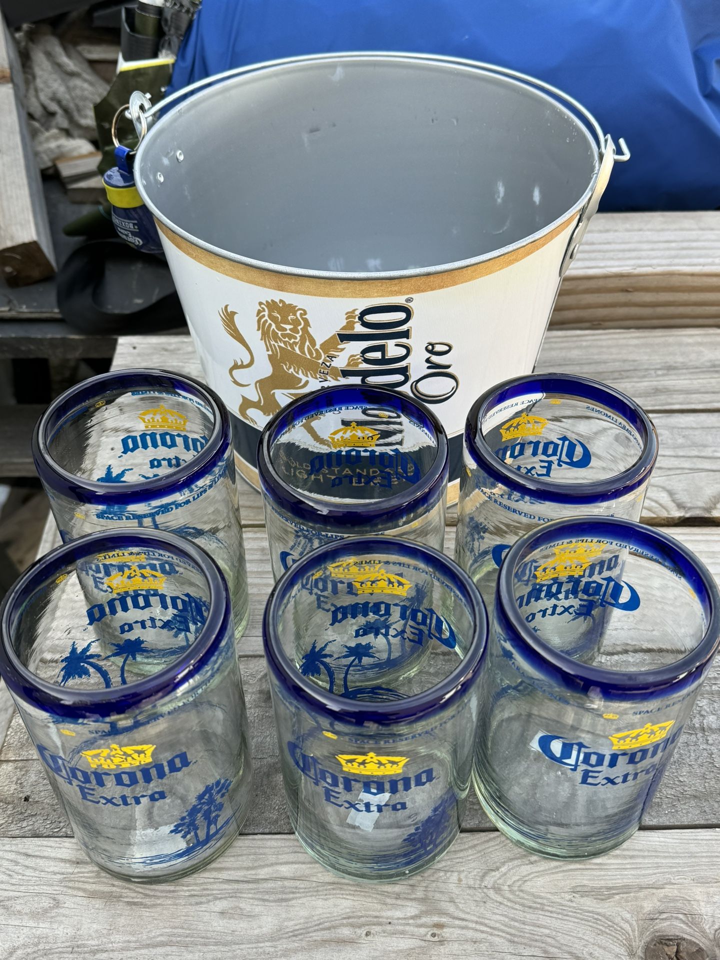 Beer Bucket With 6 Corona Hand Blown Glasses
