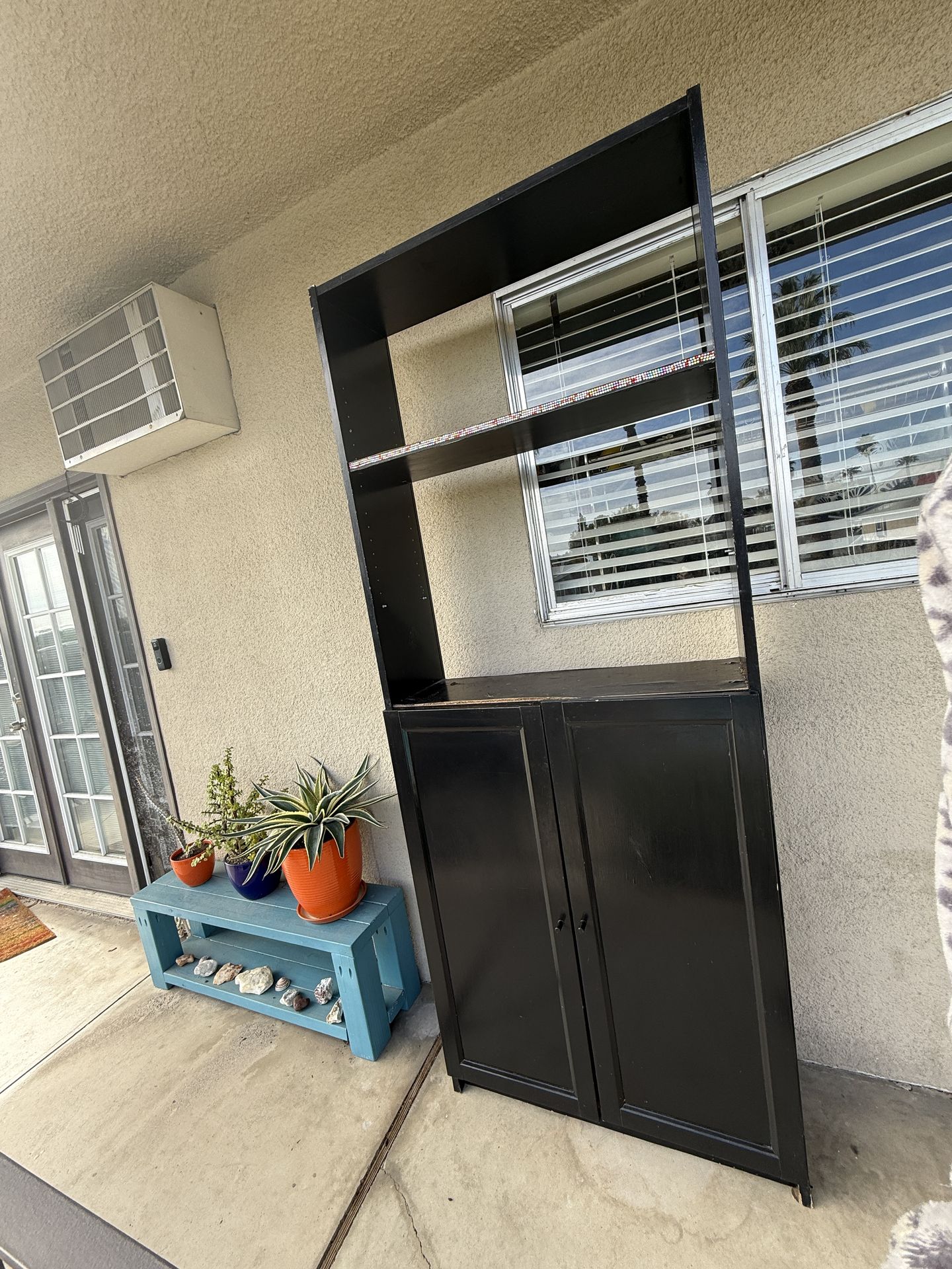 Depth 12” Height a bit over 6.5ft Width 2ft 8” Has some imperfections and little wobbly but it’s free! I was using it just fine for a lot of stuff I live on second story so there’s some stairs and I assume a truck is needed and 2 people to carry First come first serve