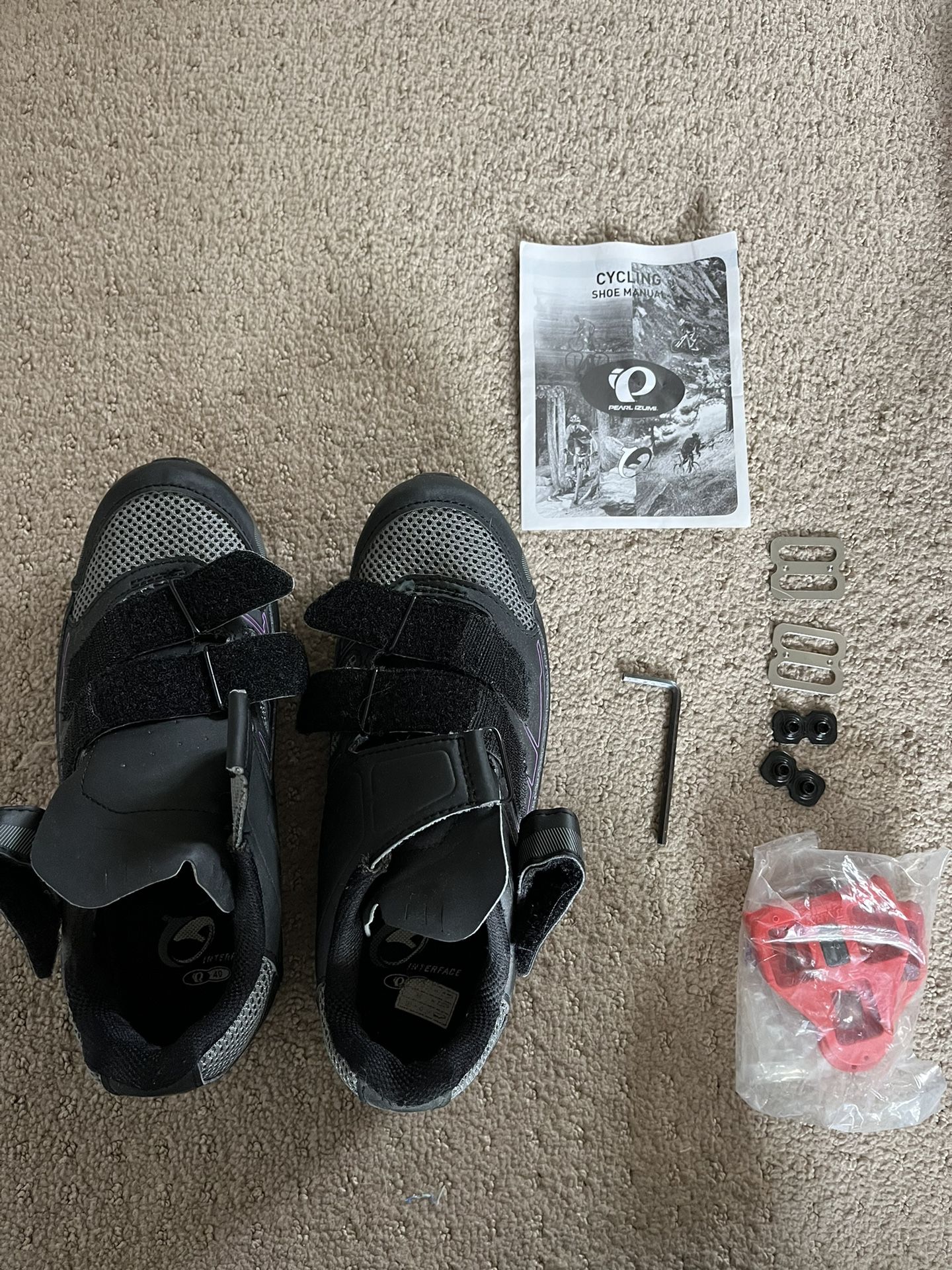 Women’s cycling shoes that clip into stationary bikes with accessories and manual. These are size EUR 40 and fit my size USA women’s 8. Used but in great condition.