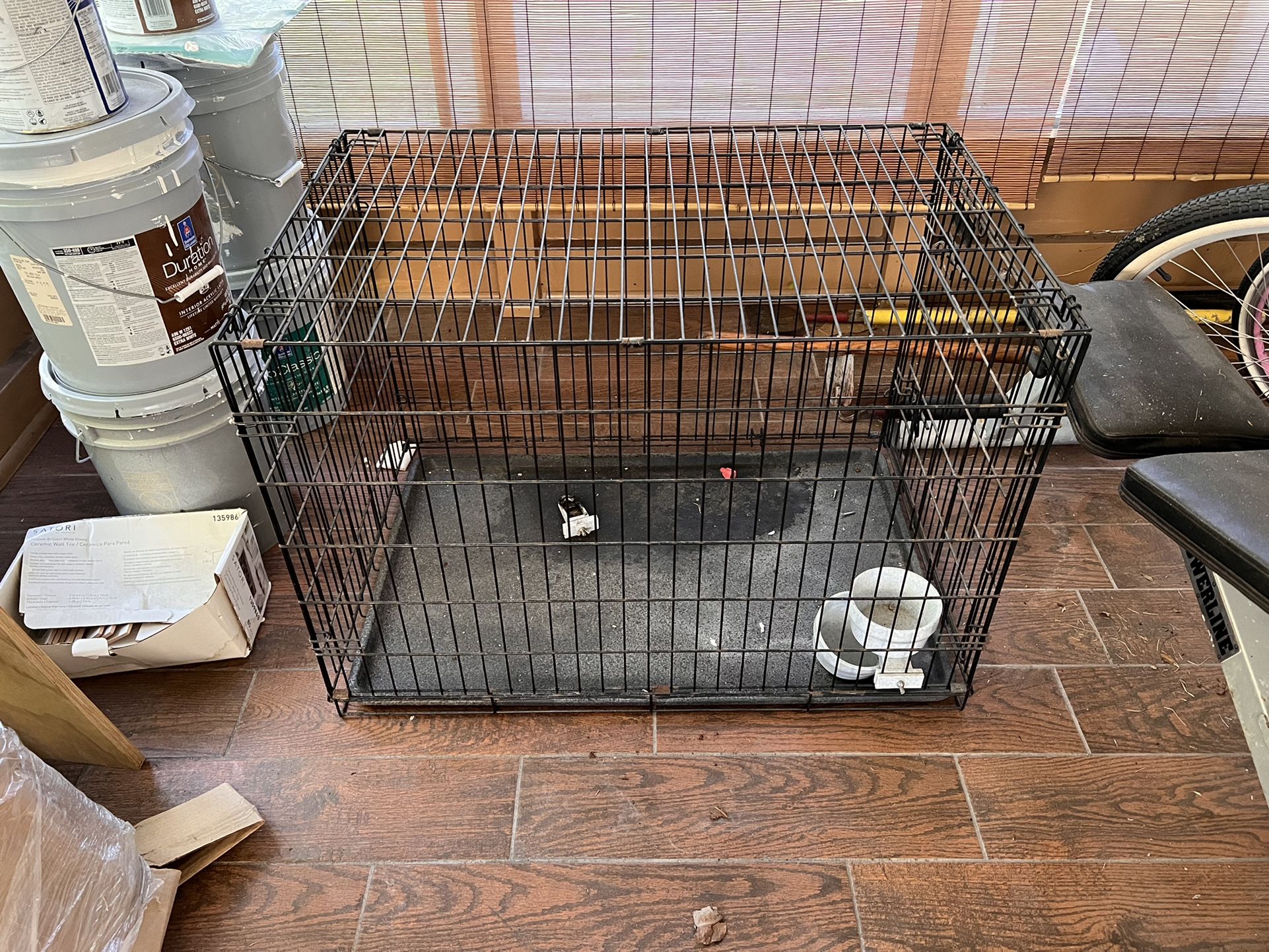 Great dog cage. Been sitting outside, so needs a cleaning. Otherwise great condition.