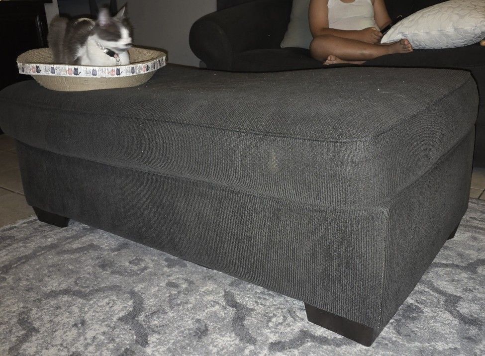 Dark gray ottoman! There are a few stains, but it still holds them feet up to relax just fine! Locals only for pickup. Cat not included.