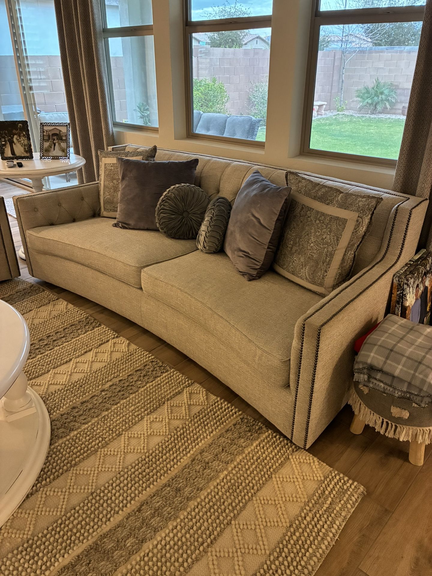 These sofas are in perfect condition! Paid over 5k for them. No rips, no stains in Excellent condition. This set will make your living room look Top Notch! All pillows are included. Tweed fabric, color is light grey.