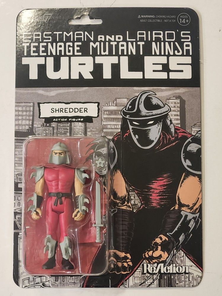 SUPER 7 REACTION FIGURES. EASTMAN AND LAIRDS. TEENAGE MUTANT NINJA TURTLES. SHREDDER 3.75 " ACTION FIGURE. $10. PICK UP ONLY CROSS STREETS THUNDERBIRD AND ELMIRAGE RD.