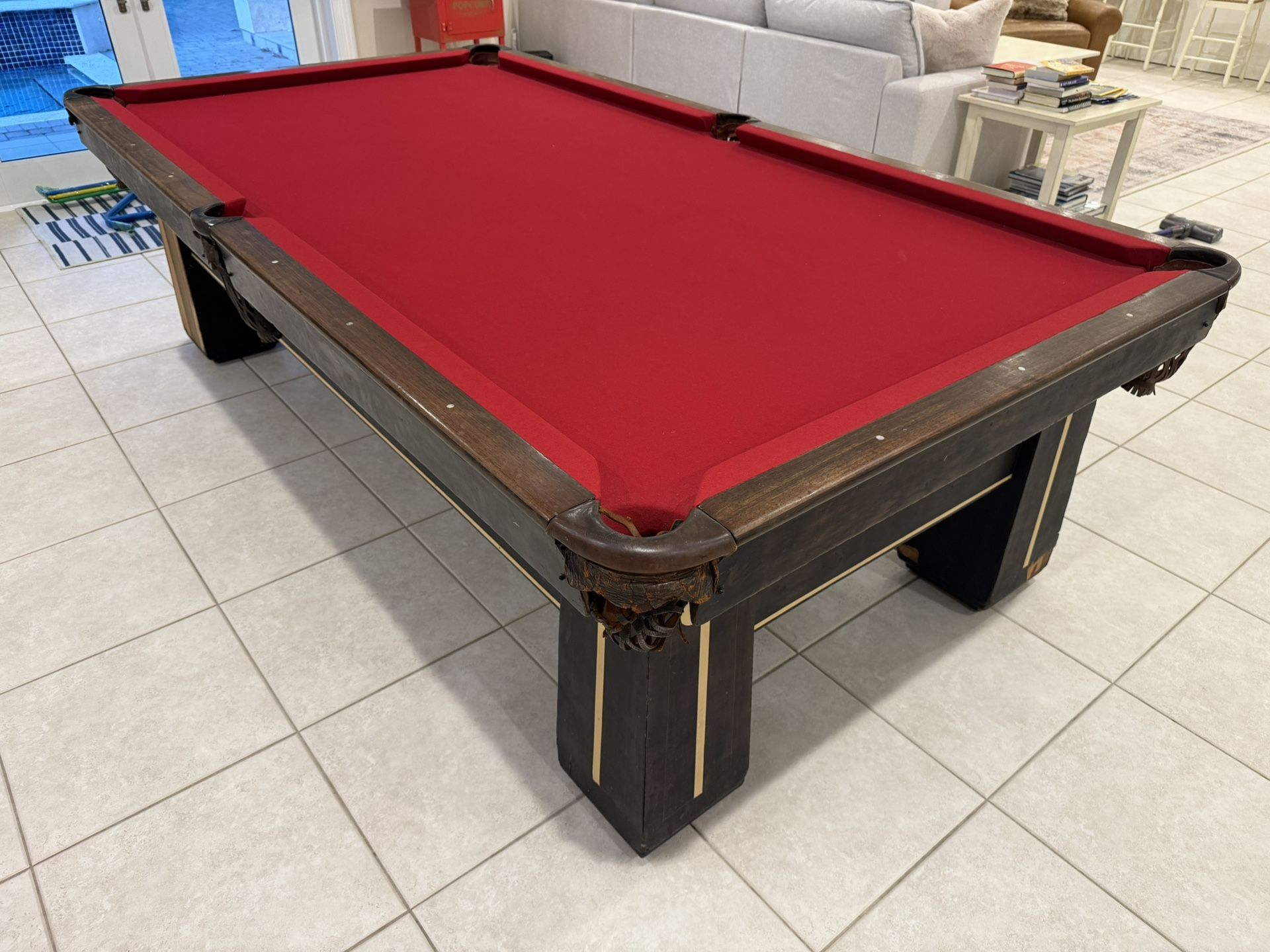 This is a 1(contact info removed) Antique Brunswick 8 foot Pool Table. It’s comprised of a 3 slates. The condition is above average given its age. It needs some laminate repairs on the legs which is aesthetic only.