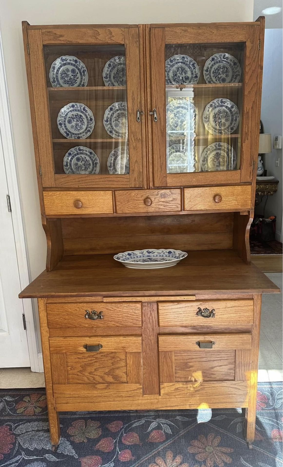Authentic Antique Oak Hoosier-Style Cabinet. Early 1900s Beautiful solid oak 2-piece Hoosier-style kitchen cabinet from the early 1900s. This belonged to my mother and was originally purchased from an antique dealer in California in the 1980s. A true heirloom-quality piece — heavy, sturdy, and made to last. Decor in photos not included — shown to highlight storage and styling. Classic Arts & Crafts / Mission style lines with upper glass display doors, spacious shelves, drawers, and a large lower cabinet. So much charm and storage — this is real, solid wood furniture from a time when quality mattered. Dimensions Bottom: 42”W x 24.75”D x 31.25”H Top: 40.25”W x 12”D x 43.75”H Total height: 75” Details • Solid quarter-sawn oak • Two-piece construction (upper + lower) • Glass upper doors • Original style hardware • Lovely natural wood grain • Tons of storage ✨ Condition Very good antique condition — solid, heavy, and structurally excellent. There is a small cosmetic water mark on the work surface (shown in photos). It does not affect the cabinet at all and can be easily refinished if desired. Price reflects this — already adjusted accordingly. 💵 $1,625 OBO — reasonable offers welcome 📍 Pickup in Simpsonville, SC This is a special, true antique piece. Serious buyers only, please.