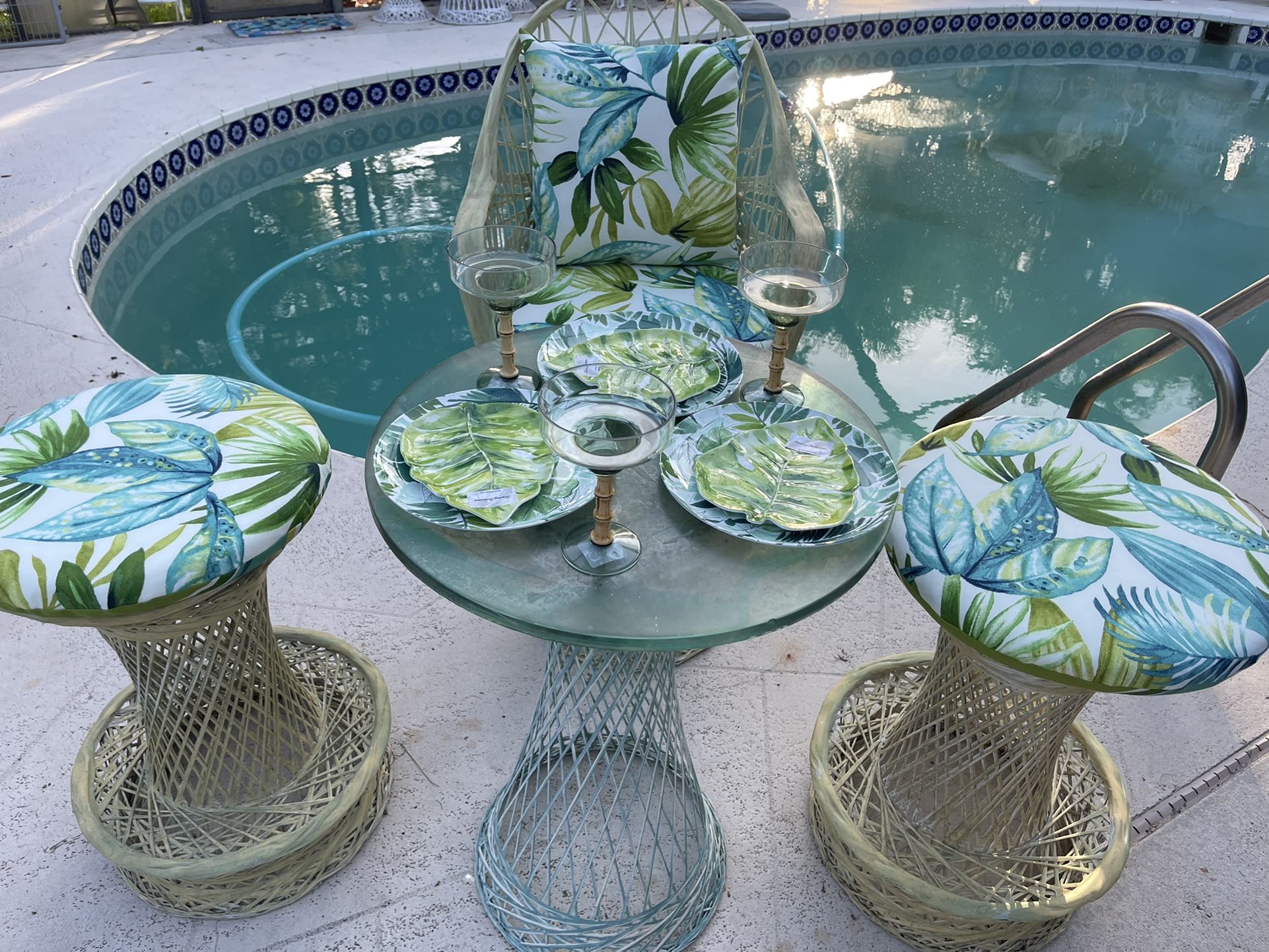MCM Tommy Bahama-Style Hightop Bistro With New Reversible Tommy Bahama- Style Seat and Back Cushions. The Cocktail/Hightop Table Has A Removable Glass Top. This Set Has The Original Green Finish and Has Never Been Painted! This Green Hightop Bistro Set Is Great For Cocktails, Dinner, Snacks, etc. to Relax and Enjoy Indoors Or Outdoors. It Will Fit In Smaller Places and Will Look Great Anywhere You Put It! A Matching MCM Tommy Bahama Bahama Bistro Set is also Available To Purchase! It’s the last two Pictures!