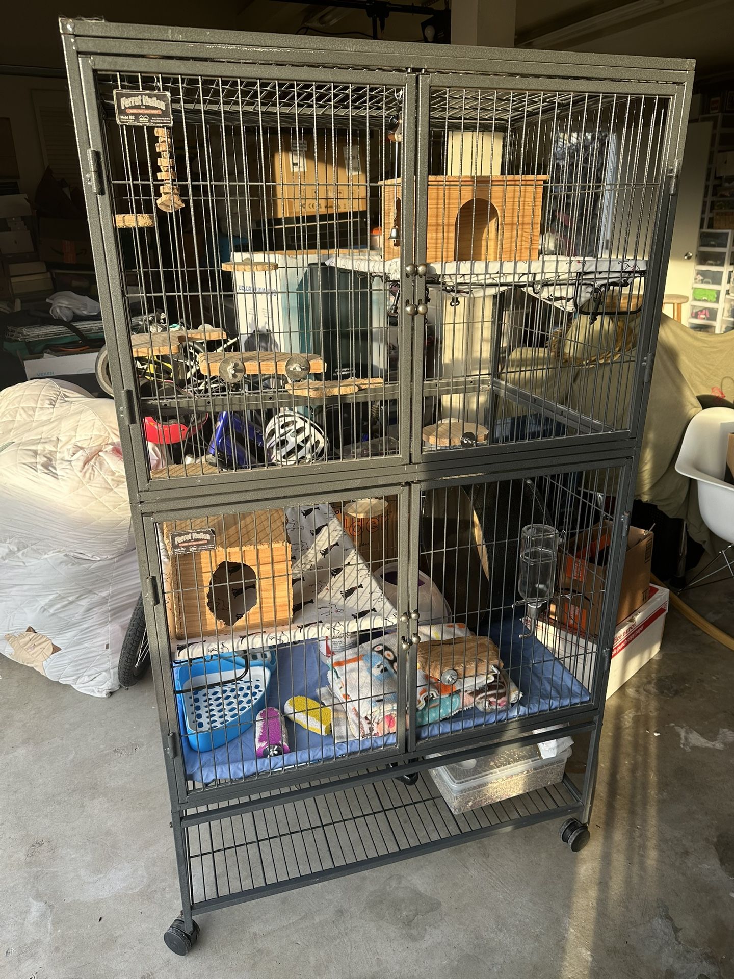 Comes with everything you need for a pet chinchilla. Or the cage can be used for a bird or ferret. Please see the dimensions in the third photo. Pick up at Hounds Estates Ct. Cash only.