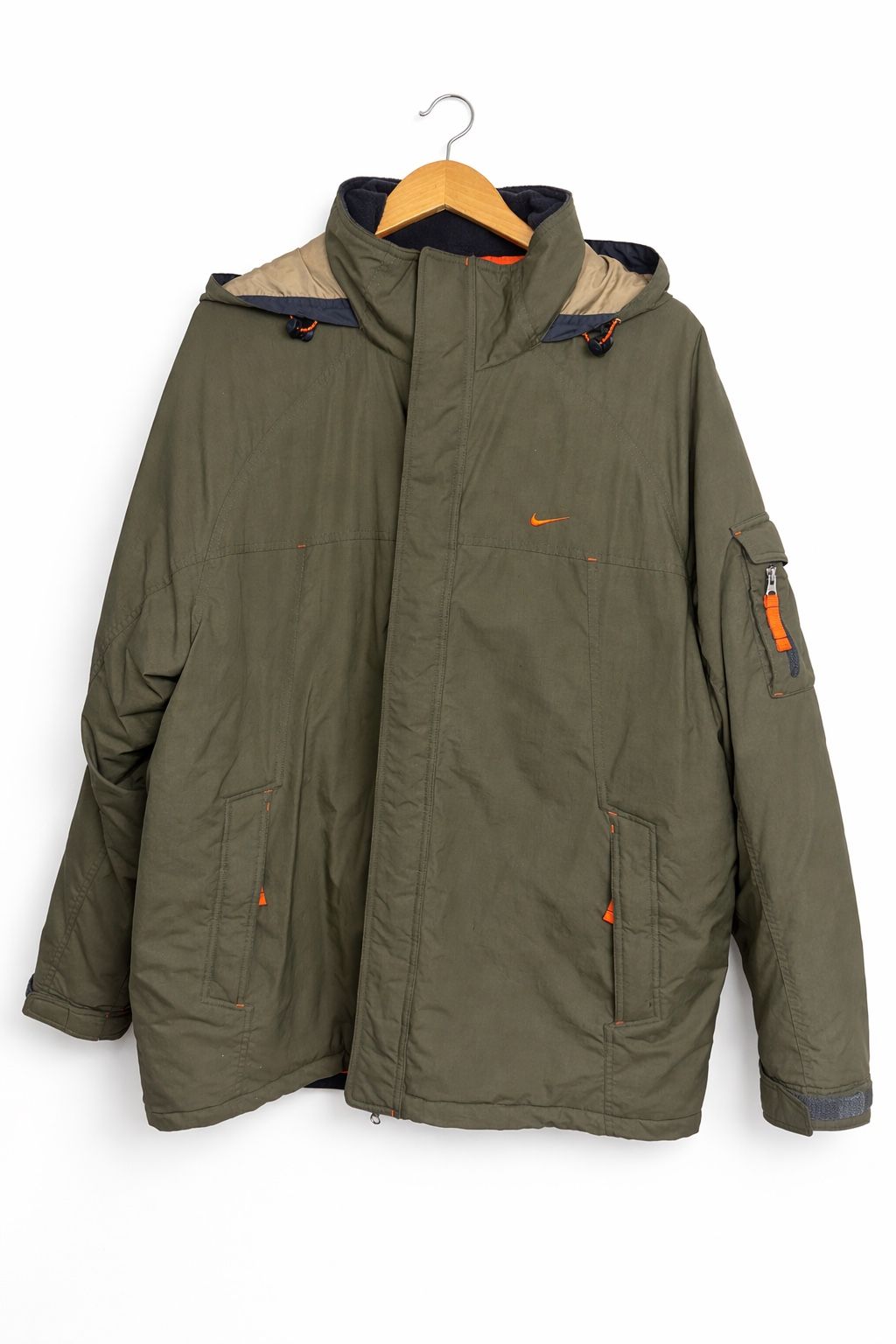 Nike olive green hooded jacket size XXL. Insulated jacket with orange accents, adjustable hood and multiple pockets including sleeve pocket. Good overall condition. No holes or tears. Some small marks on the lower back area. ❗️Main zipper has damaged teeth and should be replaced.