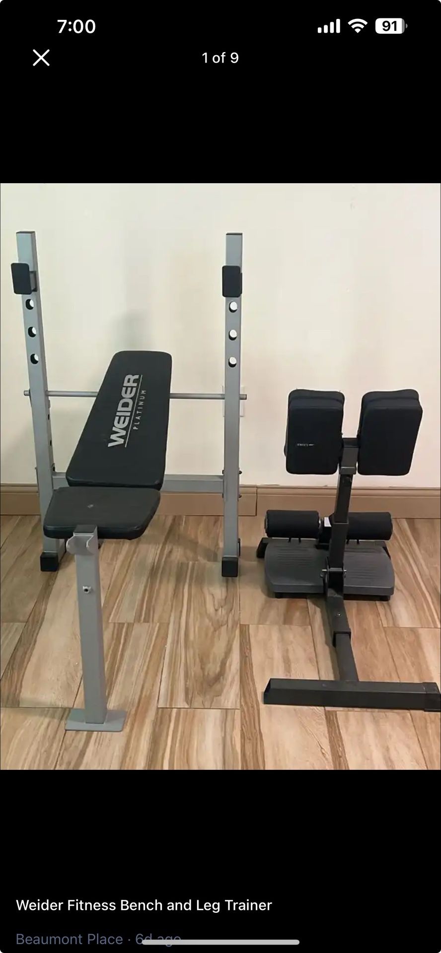 Weider Fitness Bench and Leg Trainer $70 Adjustable workout bench and sissy squat machine Weider adjustable fitness bench with leg developer. They are both used The bench is very light weight and on the smaller side The leg machine is missing the plastics end caps at the bottom shown in photo Price is for both or willing to separate No bar