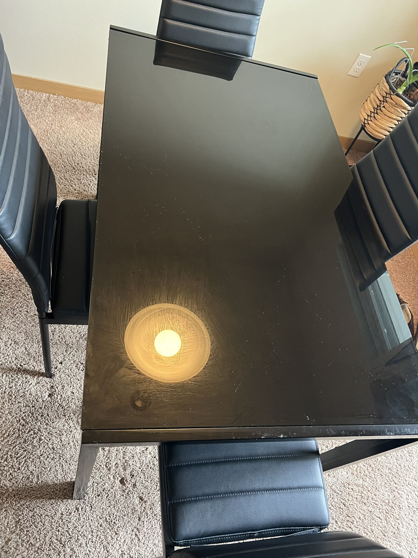Black glass top dinning table. 47.25” long 27.5” wide 29” tall Chairs x4 18” tall 38” to the top of back rest.