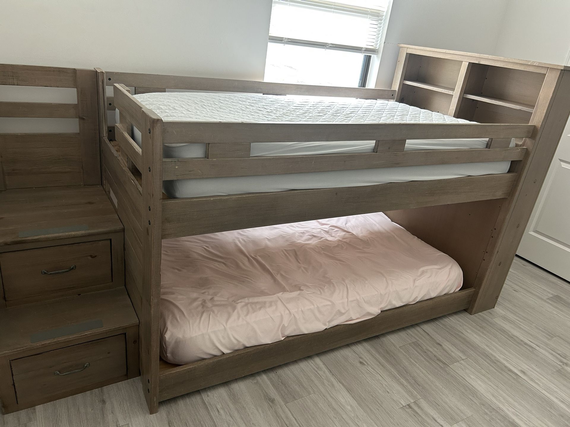 Double twin beds. Stairway with drawers and book shelves on other side. Bottom bunk can be as pictured. Also have the footer and header to make a separate bed that goes under like in the last picture. NO MATTRESSES