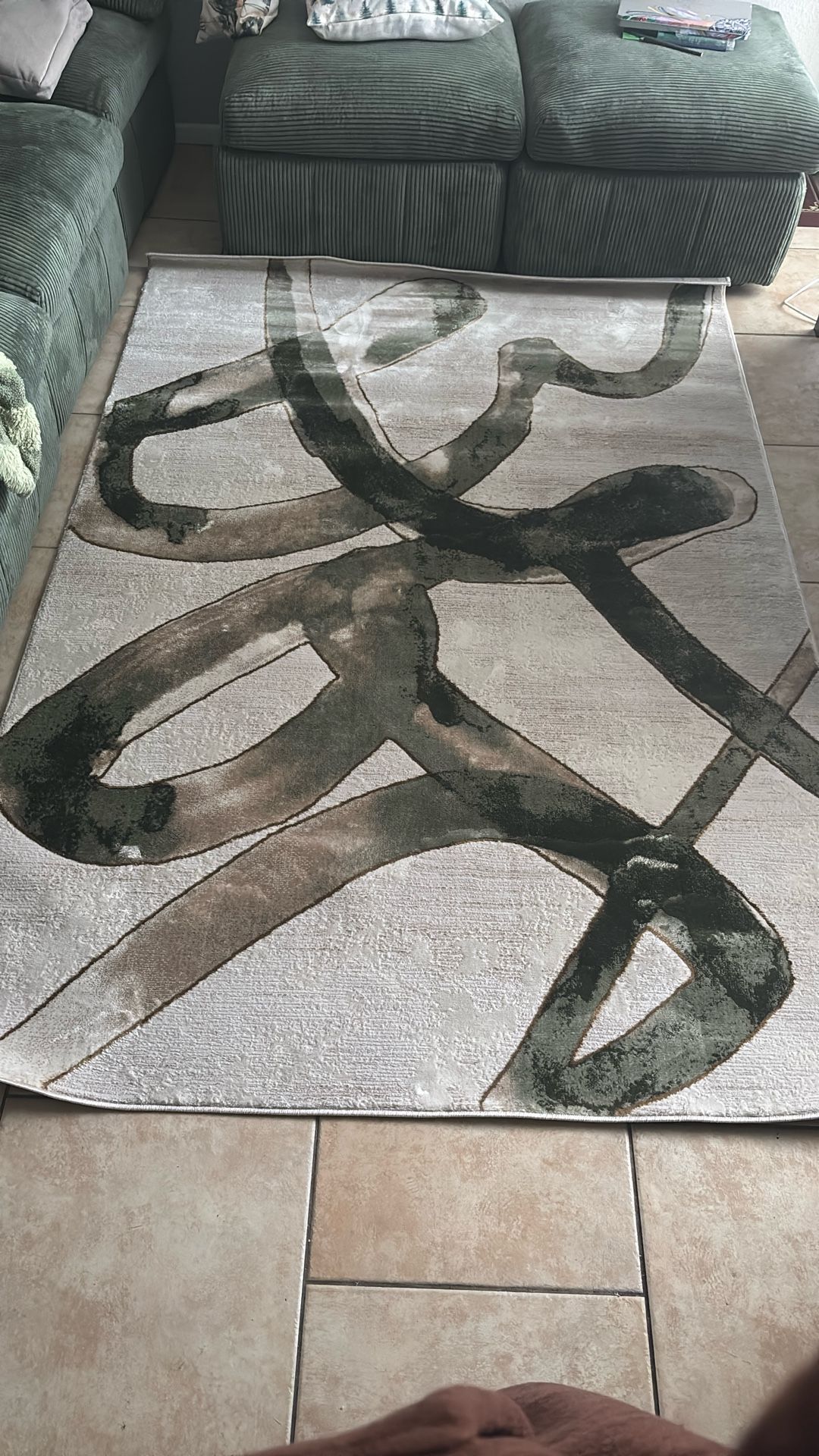Brand new. Didn’t match our couch. Details : Abani Beige Cream Green Graffiti Washable Area Rug - 5' x 8' - Abstract Artistic Design - Ivy Collection