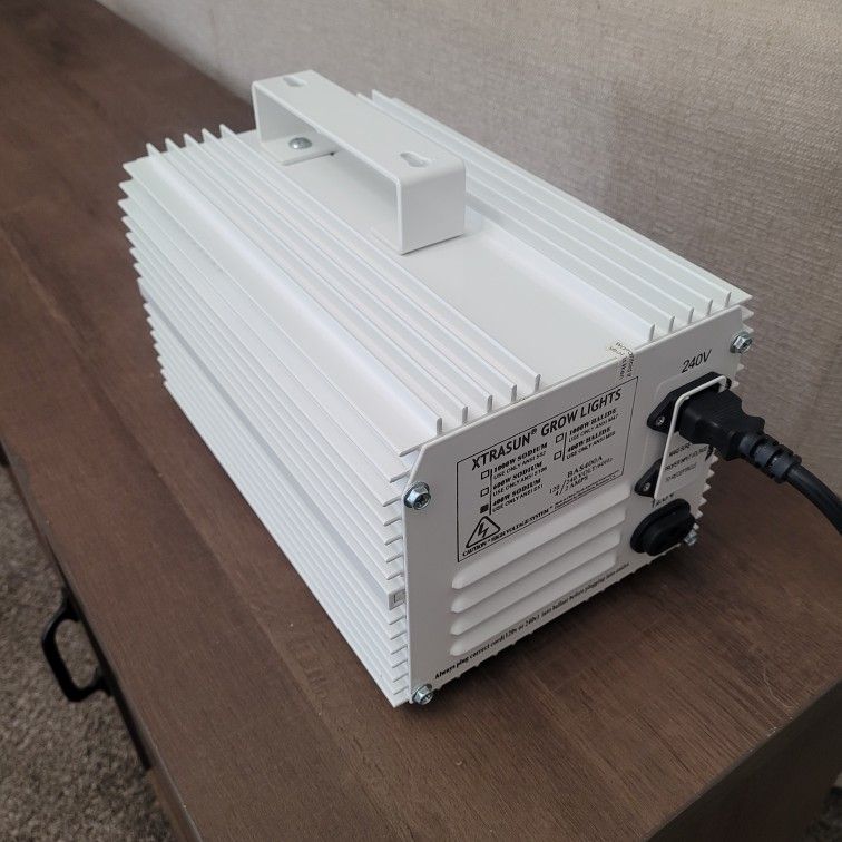 Xtrasun Grow Light ballast, specifically a 1000W Convertible Ballast designed for use with both High-Pressure Sodium (HPS) and Metal Halide (MH) grow lamps. It's a dual-voltage unit, compatible with both 120V and 240V power sources, making it versatile for various grow room setups.