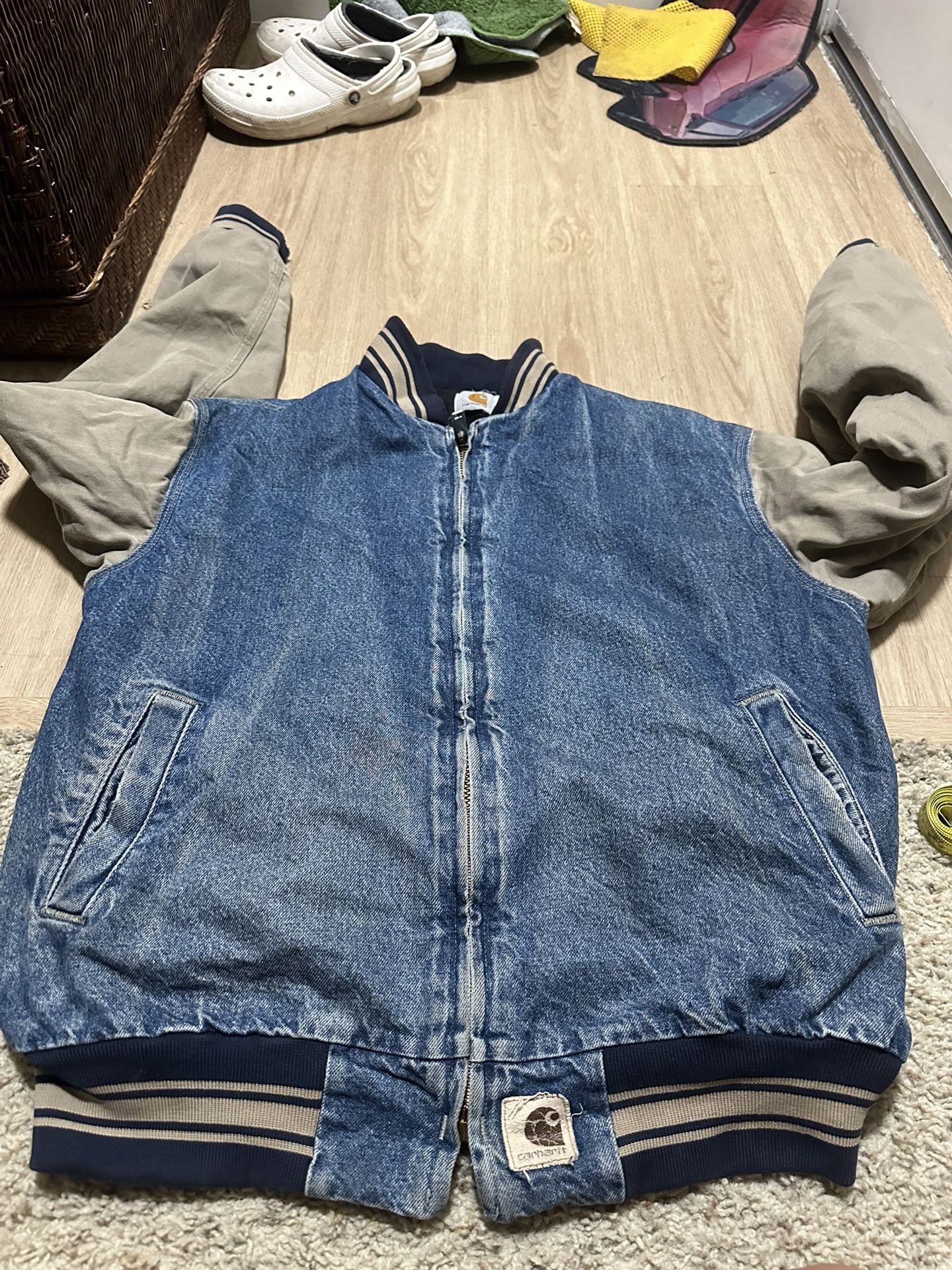 Carhartt varsity canvas/denim jacket. Men’s size large. Overall good condition with small imperfections depicted.