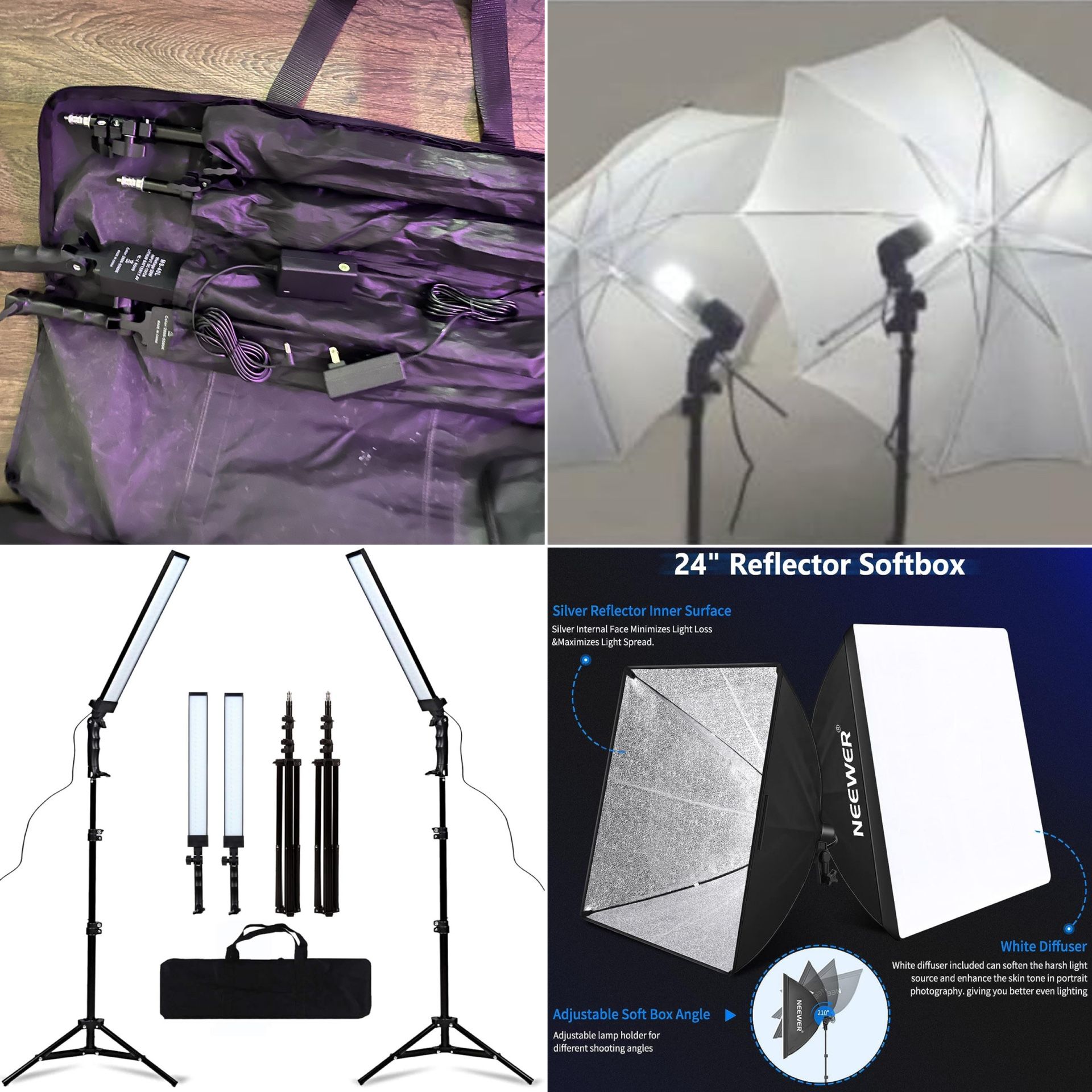 2 Softboxes (Lightly Used) 2 Umbrellas (Brand New) 2 Wired Uplighting (Lightly Used)