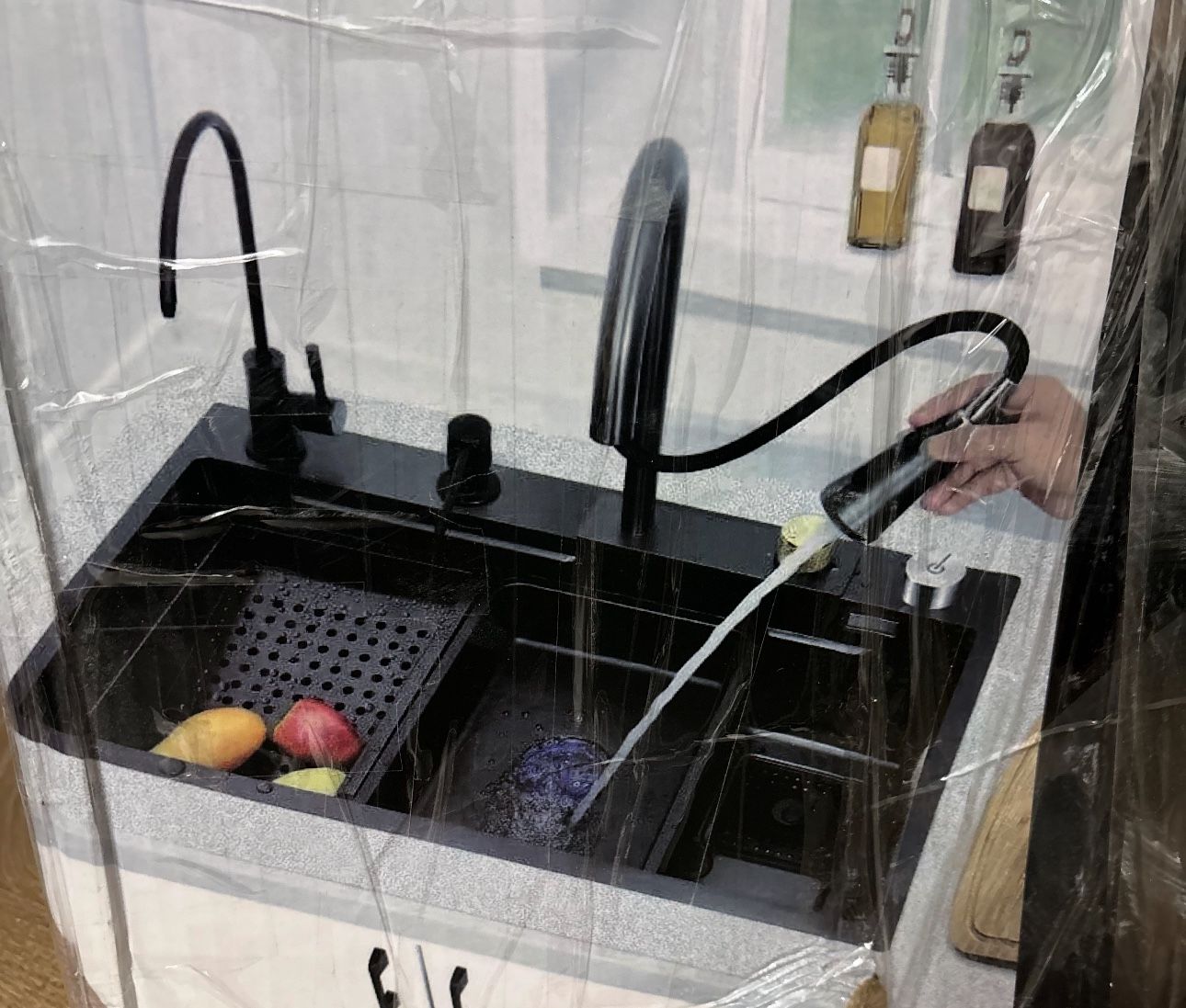 Pictures are of black sink but this one is Stainless Steel color.