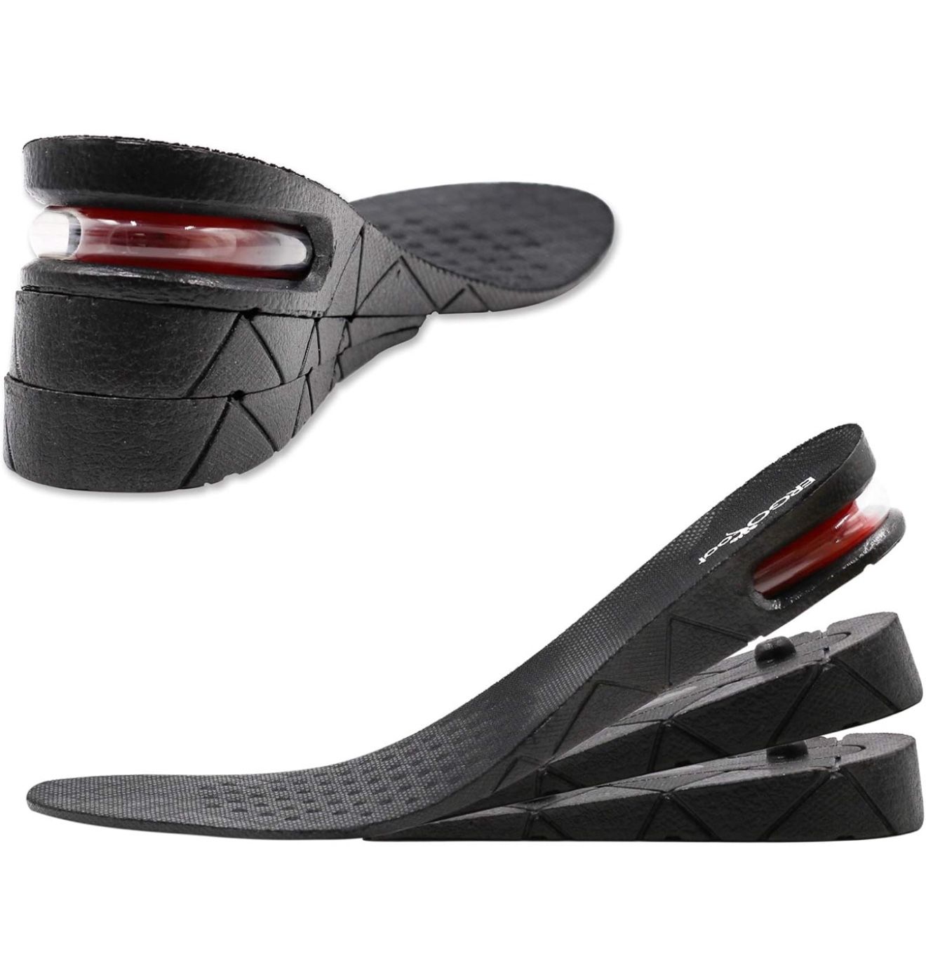 New Adjustable Height Increase Insole -ERGOfoot Height Increase Insoles offer four height options: 1.2 inches, 2 inches, 2.75 and 3.54 inches. Whether you aim to stand out in a business meeting, impress on a date, or stay comfortable during your daily commute, a simple adjustment lets you switch to your desired height and meet any occasion's demands. Shock-Absorbing and Cushioning -Engineered with responsive air cushion pods, our invisible height increase insoles absorb shock and evenly distribute pressure, turning long walks, commutes, and busy days into a weightless, comfortable experience. Breathable Top Layer: Made of skin-friendly, breathable fabric, it efficiently wicks away sweat, keeping your feet dry and odor-free even after extended wear. Anti-Slip PVC Bottom: Its specialized textured design offers a firm grip, preventing slippage during walking or sports activities for ultimate safety. Trim to fit shoe size - Our height increase insoles feature pre-marked cutting lines, allowing you to trim them precisely to your shoe size (US 4-9.5) in just minutes. Whether it’s your favorite sneakers, formal dress shoes, or casual loafers, enjoy a snug, personalized fit every time. B29