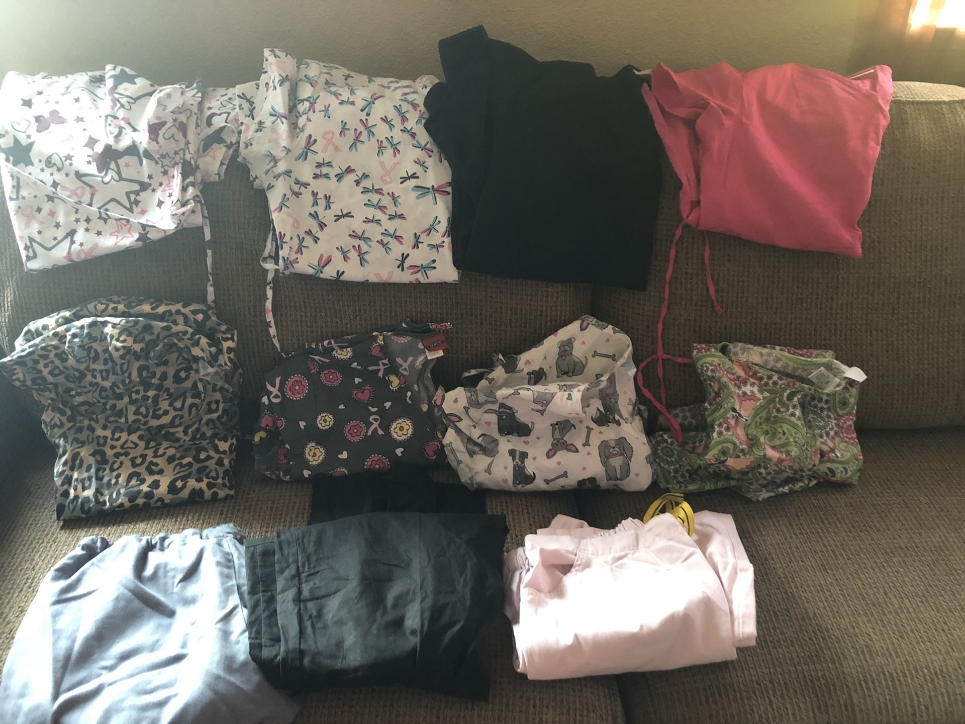 All medium except for pink scrub pants are large. 10 tops 3 pants one for 4$ or all for 40
