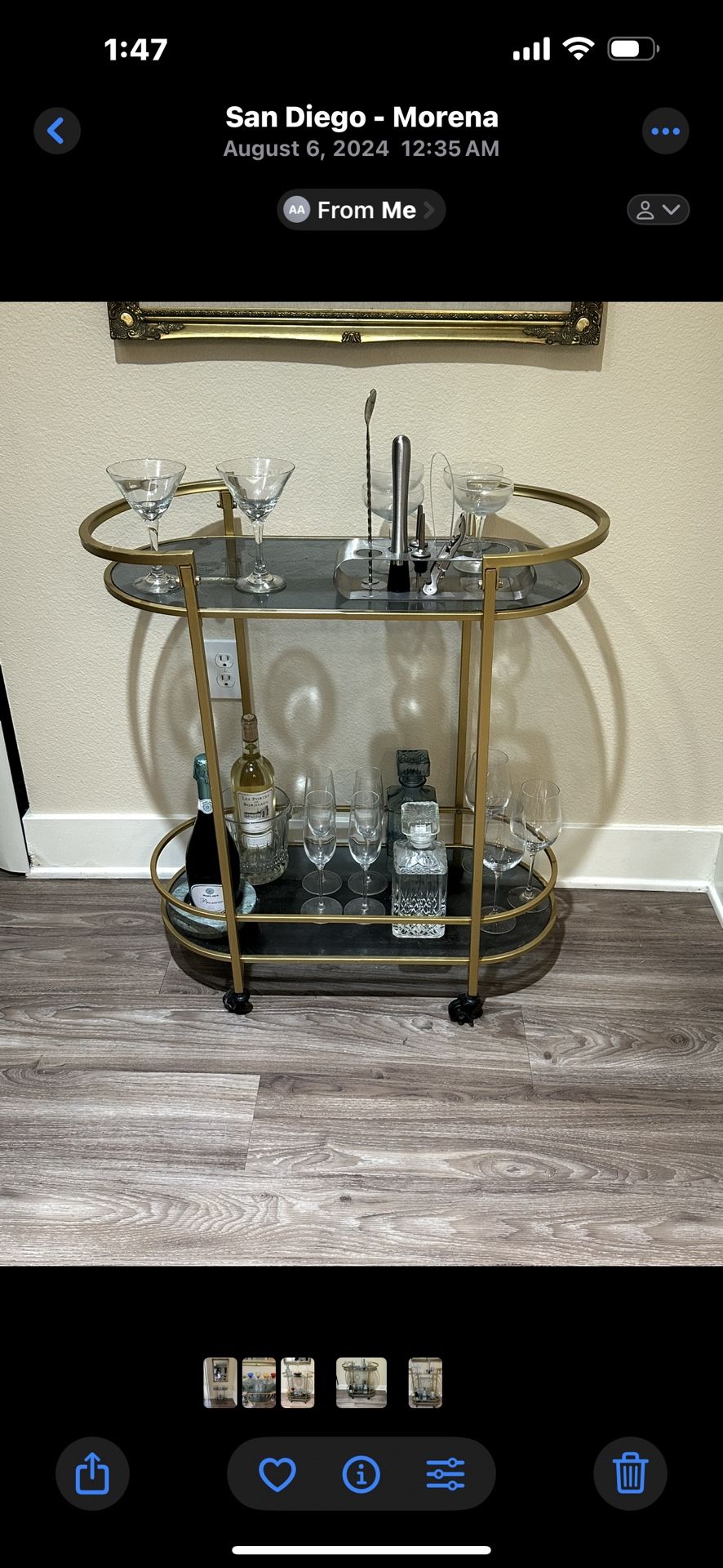 2 tiered Gold art deco bar cart with tinted glass shelves