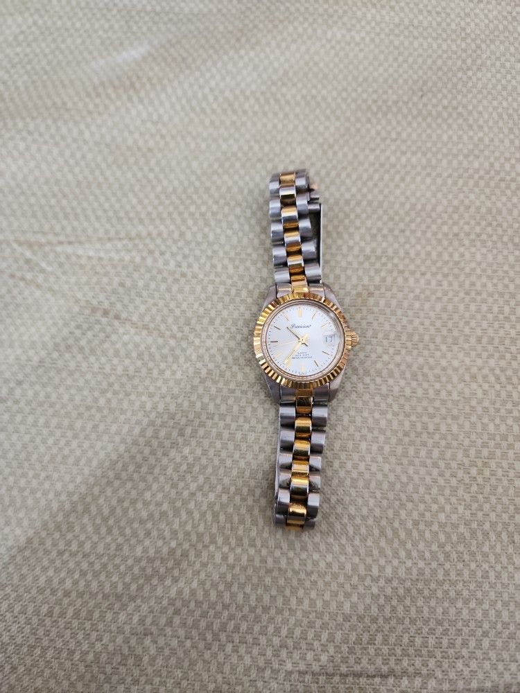 This beautiful vintage ladies watch was made by a watch company called Precision.Its two-toned,gold and silver.The watch needs a battery but it does work