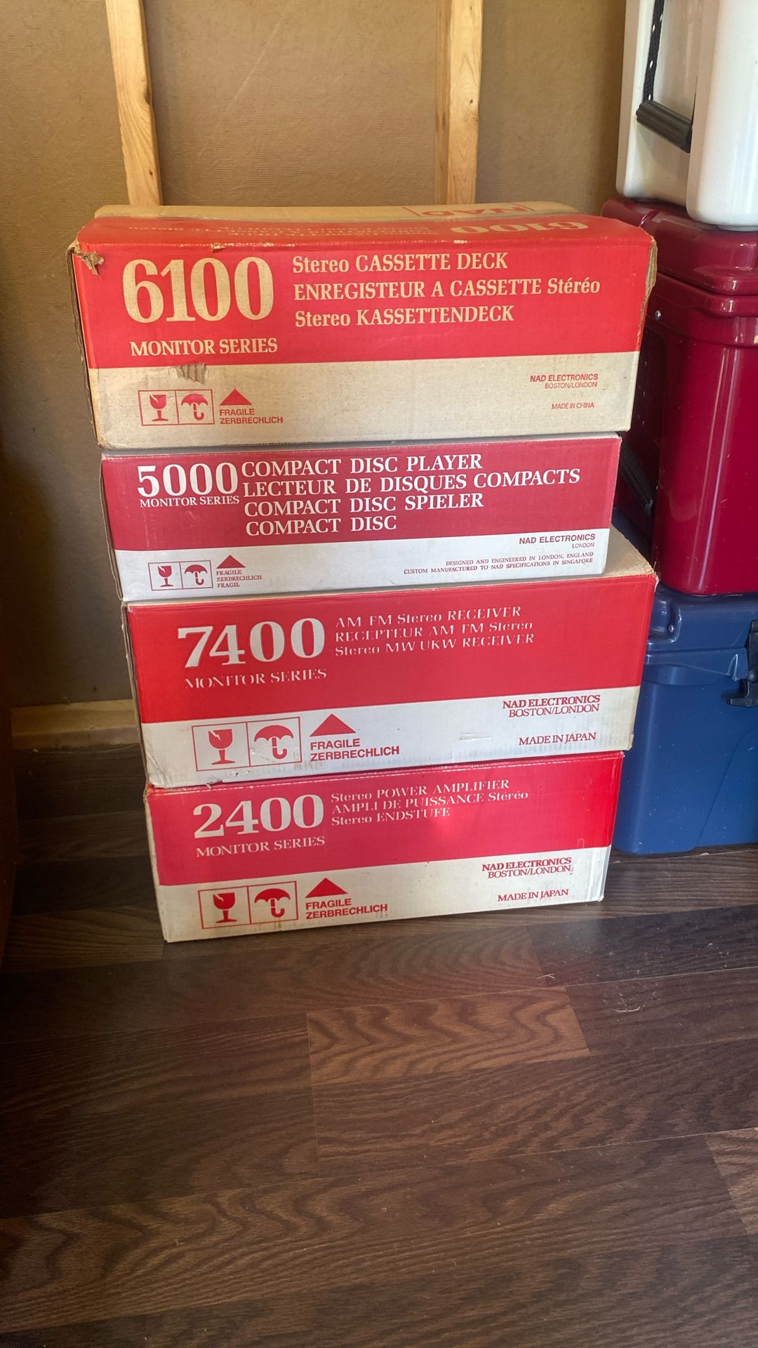 NAD stero system 6100 cassette Deck 5000 cd player 7400 am /Fm stereo receiver 2400 stero power amplifier speaker LX 44 Speakers 2 of them