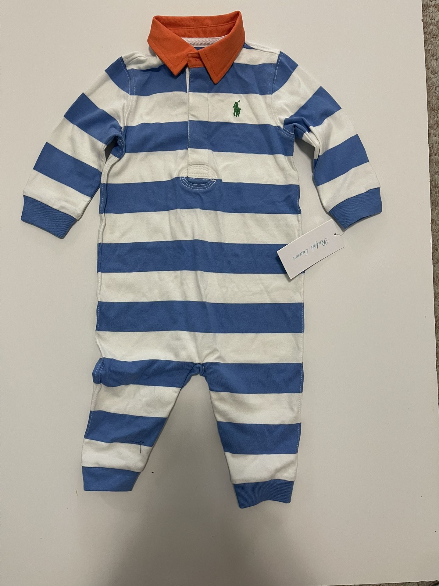 Authentic Ralph Lauren long-sleeve rugby coverall for baby boys. This classic piece features a timeless blue and white striped pattern with a vibrant orange contrast collar and the iconic green pony embroidery. • Size: 9 Months. • Design: Polo-style rugby collar with a hidden button placket. • Convenience: Snaps at the hem for easy diaper changes. • Quality: Premium soft cotton, perfect for sensitive skin.