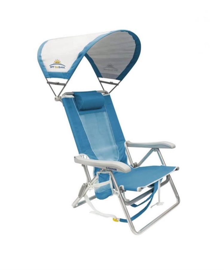 Outdoor SunShade Backpack Beach Compact Reclining Low Profile Chair, Saybrook Blue, New in Box Innovative, low seat chair perfect for your next beach getaway Adjustable shade canopy made with UPF 50+ fabric to maximize sun protection Convenient backpack straps for hands-free carrying Oversized storage pouch and phone pocket to keep your belongings safe 4-position backrest and head pillow for all day comfort Durable powder-coated aluminum/steel hybrid frame Solid armrests for extra support when sitting down or standing up Convenient beverage holder to quench your thirst Supports: 250 lb Seat Height: 11.4 in Item Weight: 10.2 lb