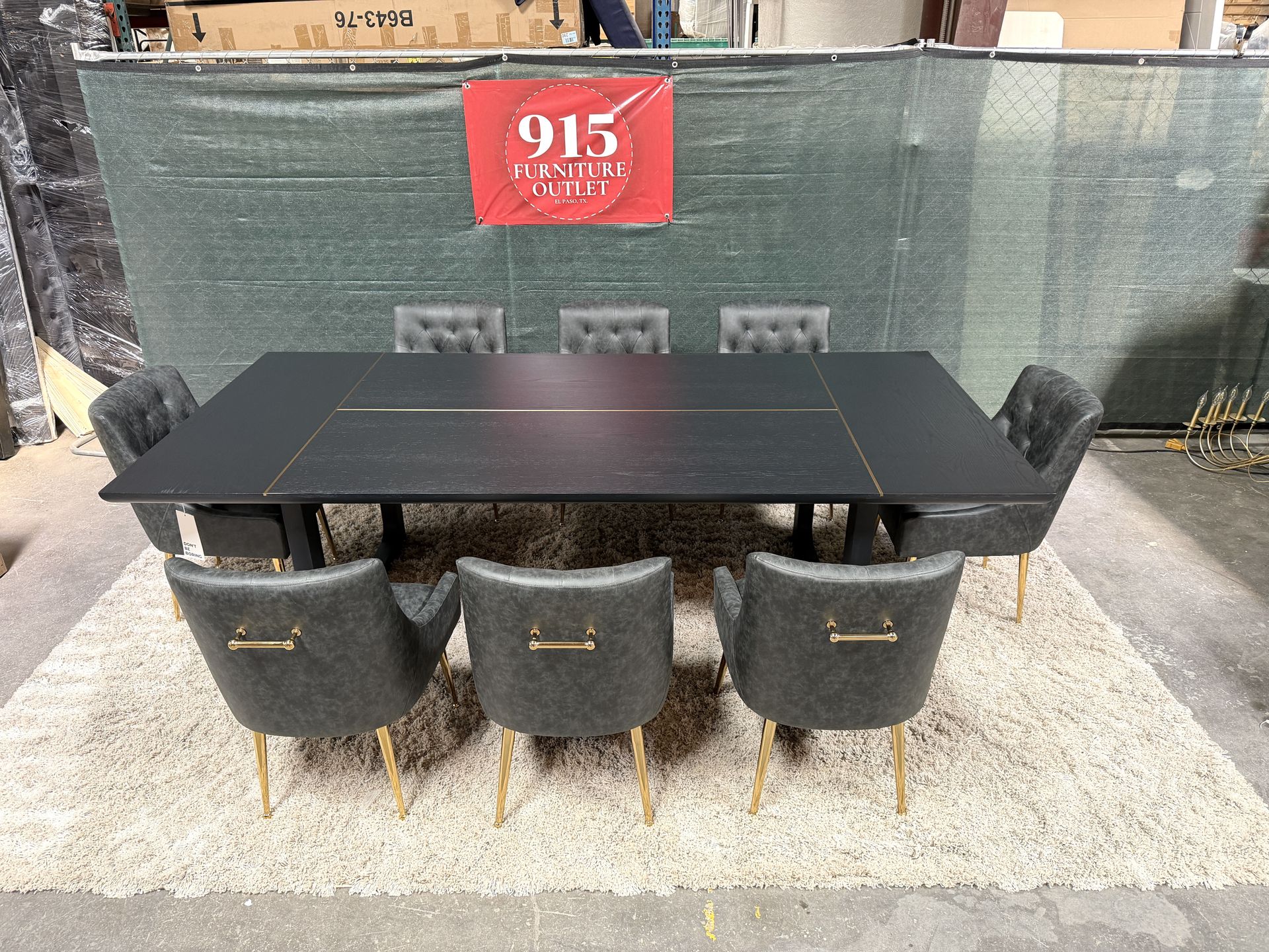 9 Piece Dining Set NEW from Wayfair,Include Super Elegant Modern Dining Table,Room for 8-10 people,Gold Metal Accents on Top,Black Ash Finish and 8 Faux Leather Chairs with Gold Finish Legs and Handle Dimensions 102β Wx 30.3β Dx 30.3β H,Priced to Sell Asking ONLY $1799 (Small dent in corner on the table)We accept Major Credit Cards π³,Finance Available 90 Days without interest,NO CREDIT NEEDED Located on 4673 Osborne 915furnitureoutlet