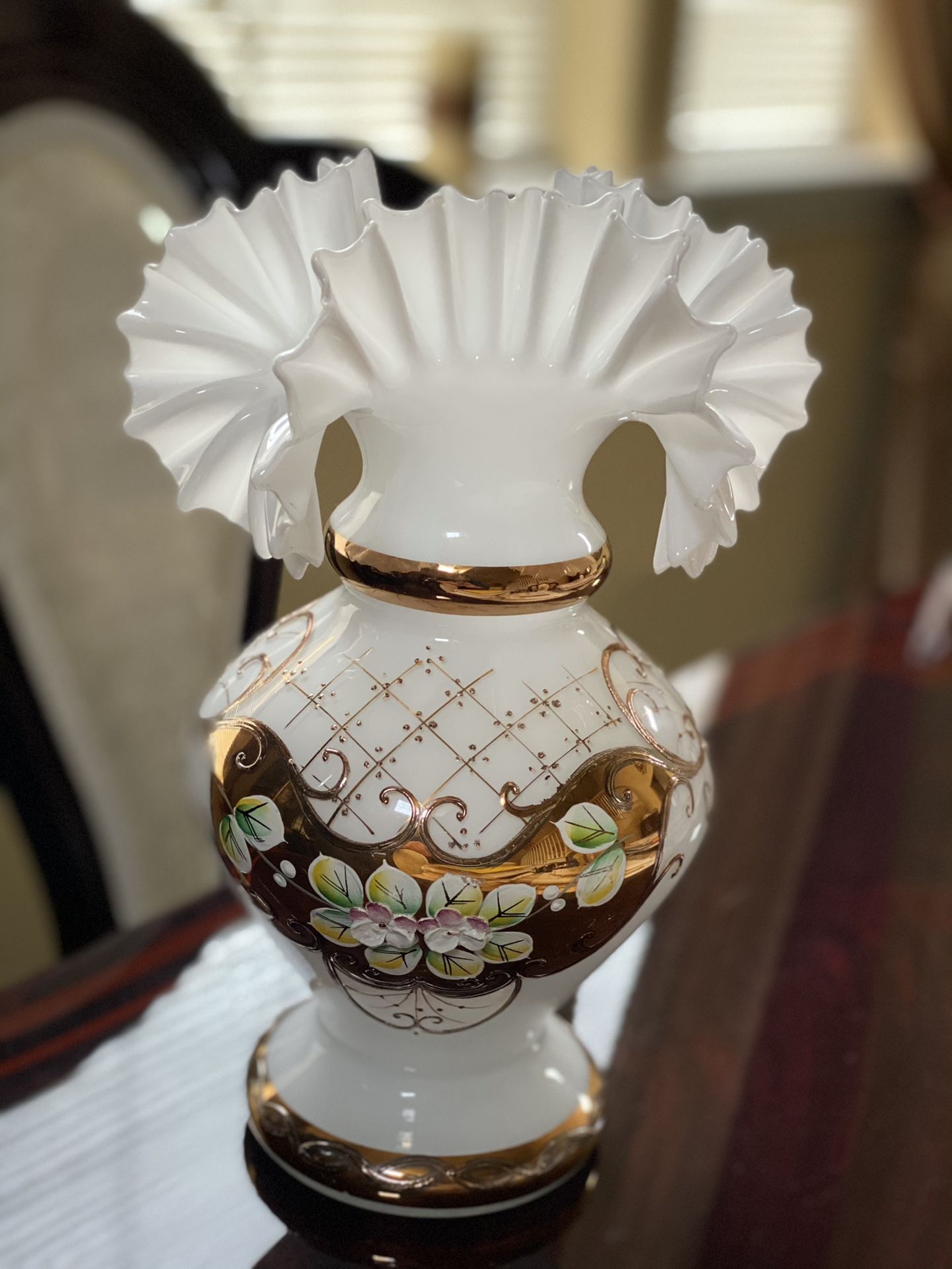 Flower Vase. Hand made in Europe. White Crystal, Enameled, Painted and Decorated in 24-karat Gold. Never been used.