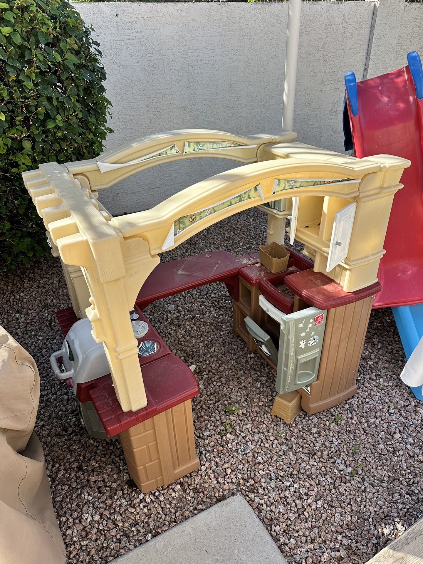 Item is weathered and does not have all screws but snaps together solidly enough to play without
