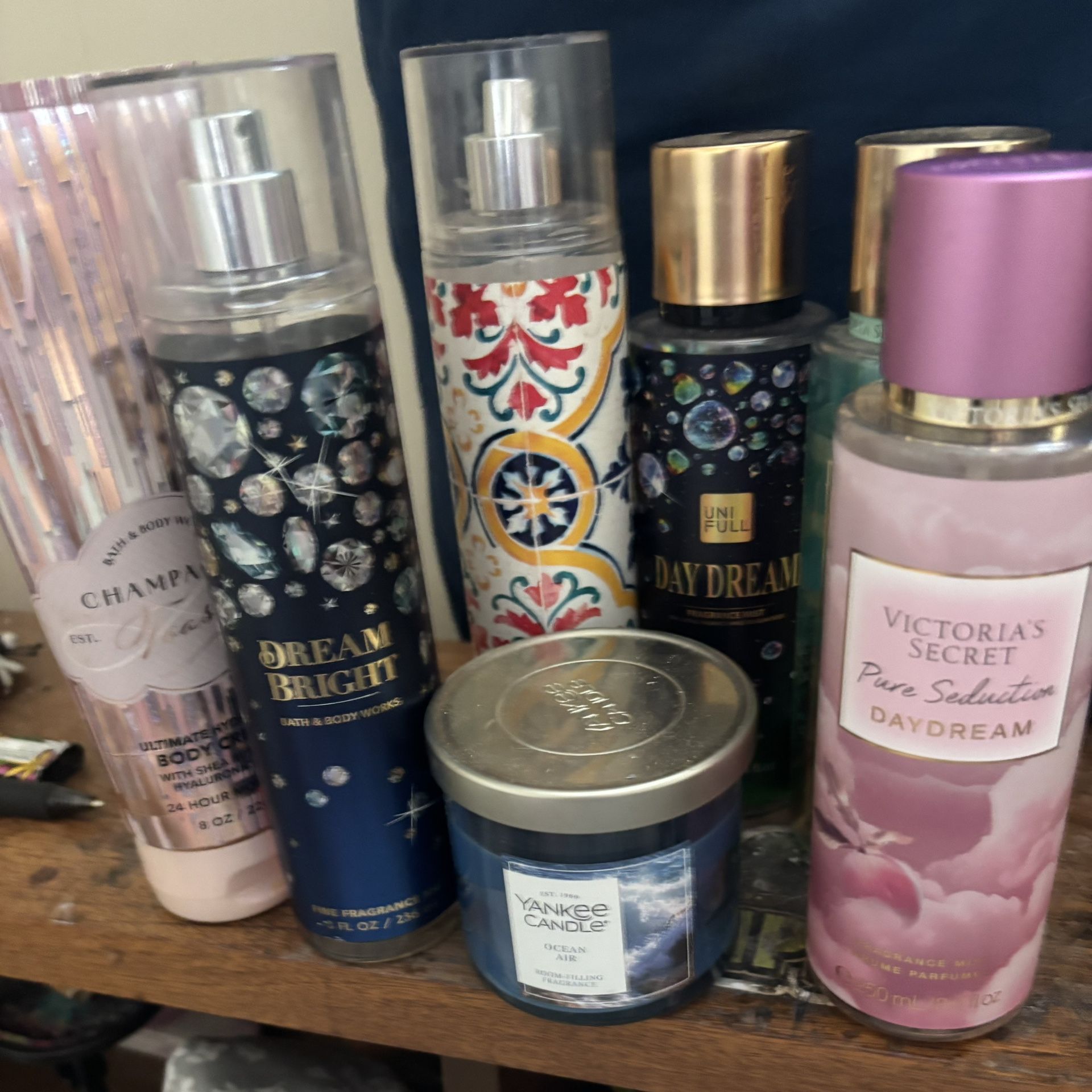 Five fragrances by Victoria secret and bath and body works..yankee candle..one body lotion. Pink seduction Dream bright Juniper glow Daydream Capri coastal citrus Yankee candle-ocean air Body lotion is champagne toast