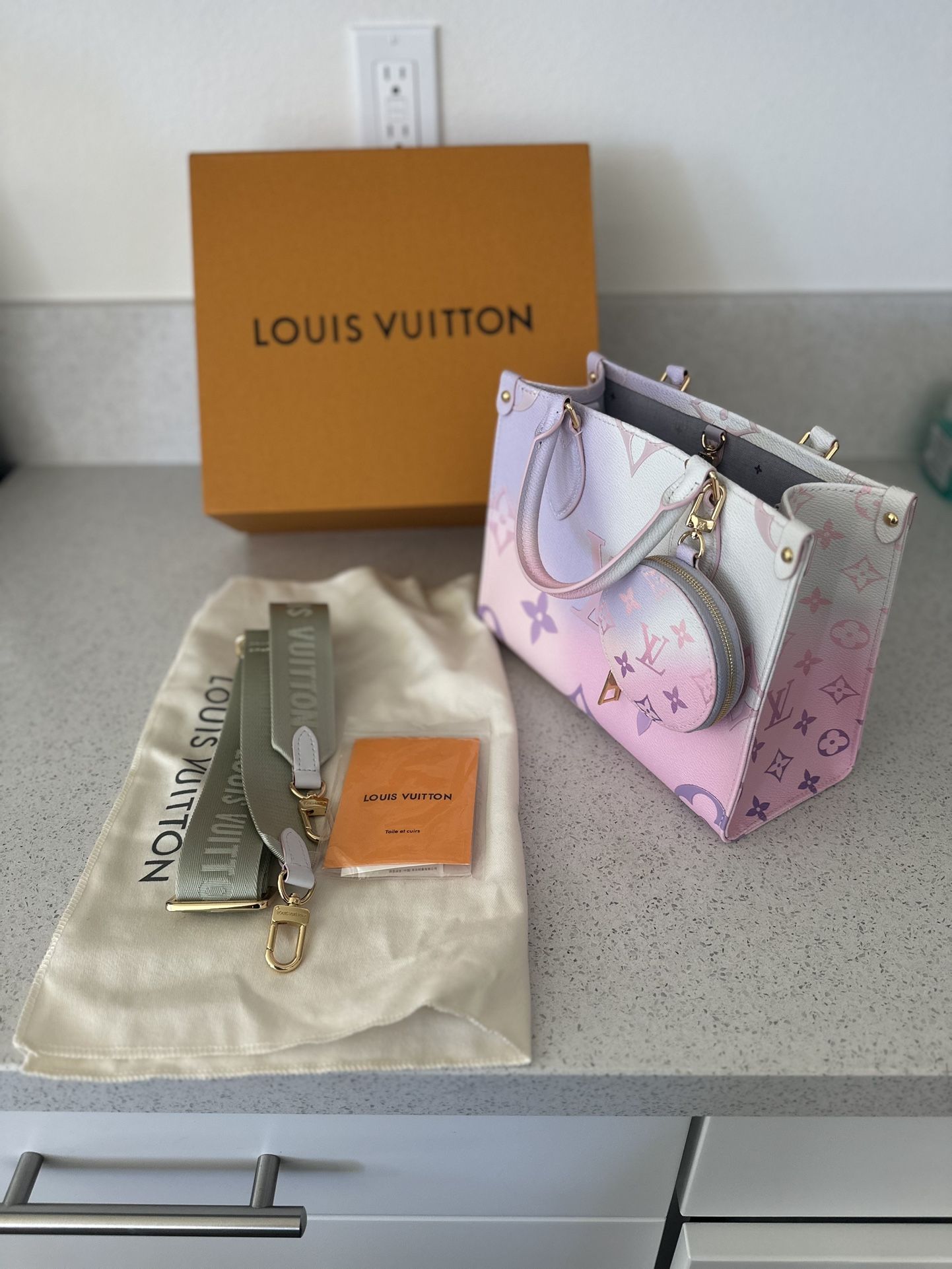 Absolutely stunning Louis Vuitton pastel ombré monogram bag in excellent condition. Soft white-to-pink gradient canvas with gold hardware and matching round mini pouch. This piece is a total statement bag and perfect for spring/summer. Condition: Like new. Clean interior. No stains, no peeling, no odors. Corners are beautiful. Hardware is still bright and shiny. Structured shape with no sagging. Well cared for. Stored properly when not in use.