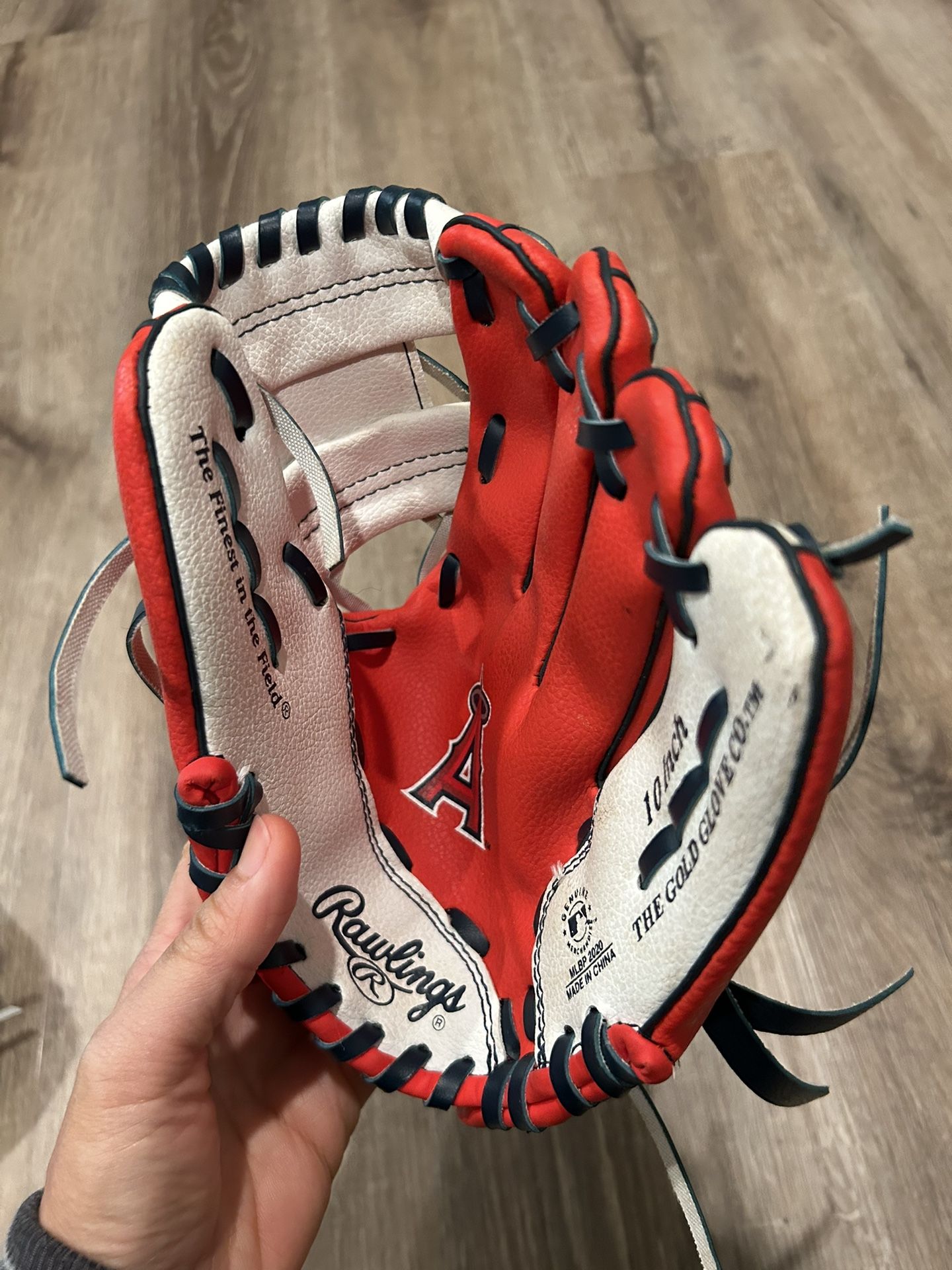 Red and white Angel’s Rawling’s baseball glove. In good, used condition. 10 inch. Porch pick up in SJC. Cash only.