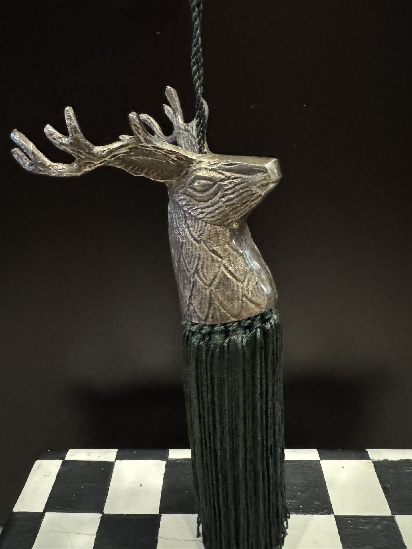 Vintage Silver Tone Stag Head Tassel Emerald Green