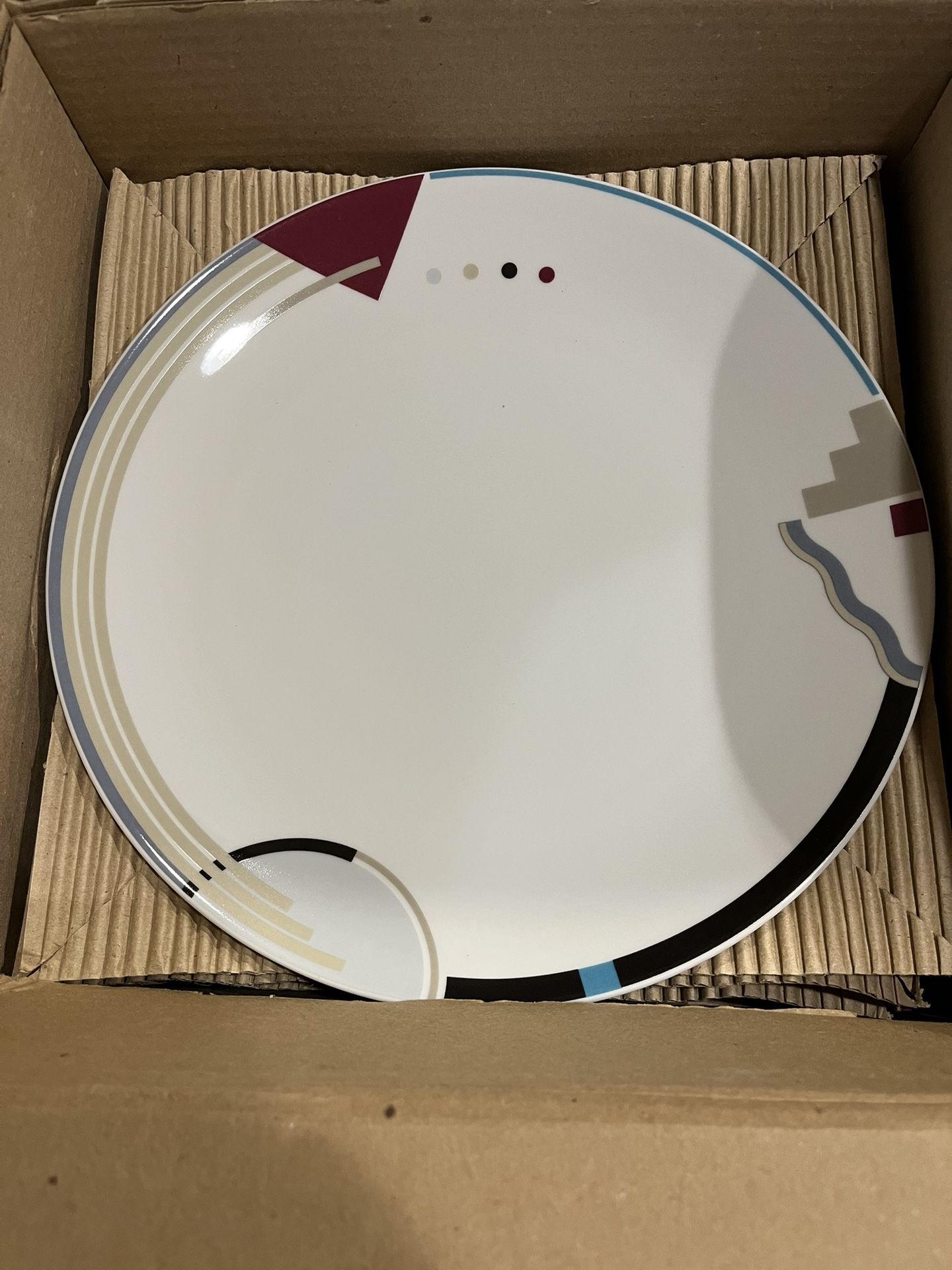 This Studio Nova China is limited edition which was purchased, stored and never used. It is perfect condition with all the original packaging. It is a modern southwestern design that doesn’t accent our current home decor. We started doing early spring cleaning and are selling items that have not been used, but have been protected and stored that is taking up space in our home. Two 20 piece service sets equals service for 8, a 5 piece serving set and a matching coffee thermos. This set is a masterful design with an elegant modern flair.