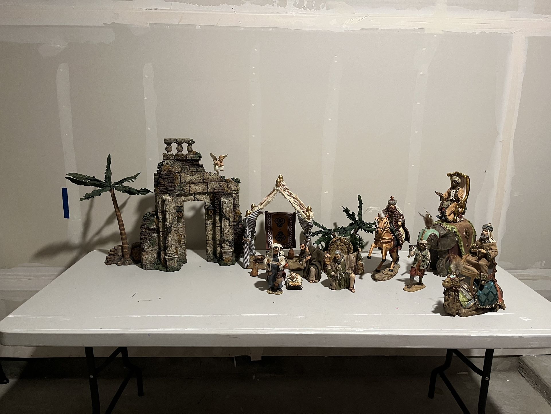 Huge vintage nativity. Shown displayed on a 6 foot table. Battery powered lights on the entry way and running water in the well. Pieces are solid, not hollow!!