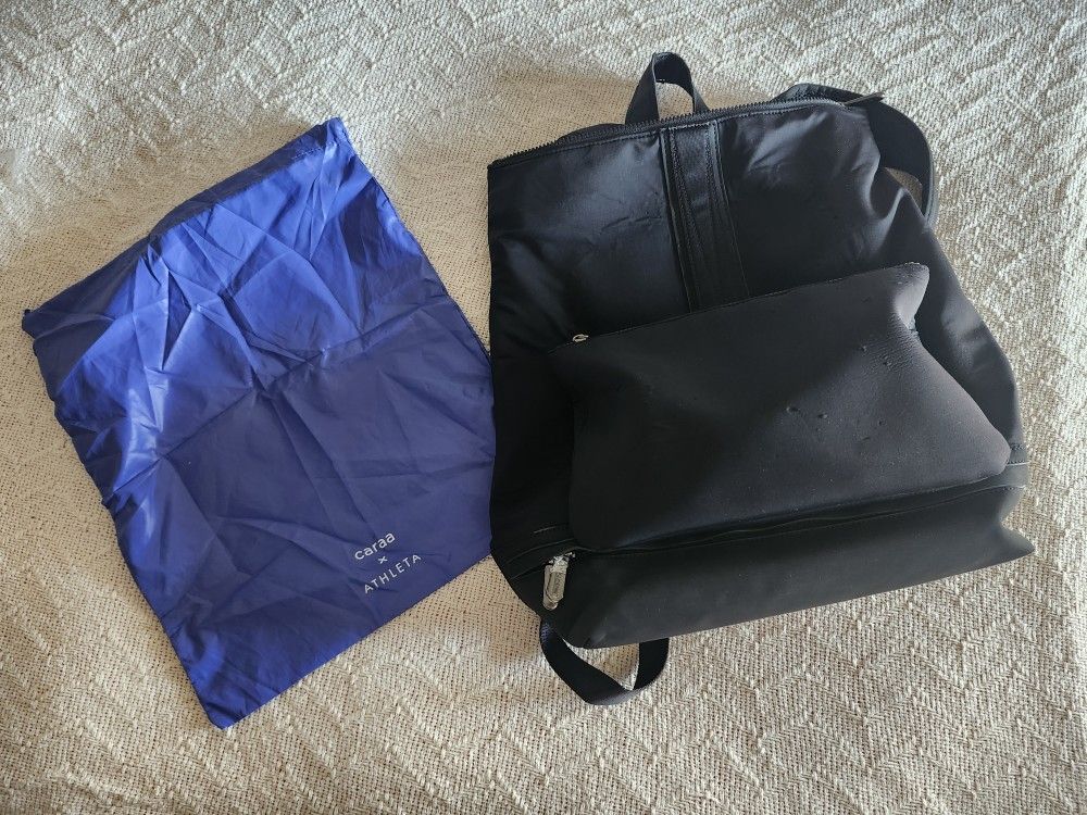 The CARAA X ATHLETA Black Nylon Neoprene backpack and detachable purse with strap is a stylish and functional backpack perfect for travel. Made with durable neoprene material, this large-sized backpack features a zip closure and adjustable nylon straps for convenience with several pockets! Beautiful blue internal lining. Can be used as a backpack or a shoulder bag, with detachable crossbody strap. This is pre owned in good, clean condition. There is a slight defect on the top handle as pictured. Also comes with the travel shoe drawstring bag, also pictured.