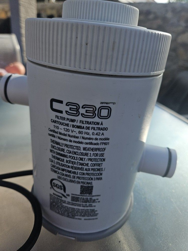 Pool pump C330 model for above ground pools. Believe this goes up to 300 gallon pools. Can be used for fish ponds...moving water. Has timer also for convenient shut off. Pick up on Westside by Helen of Troy and Resler